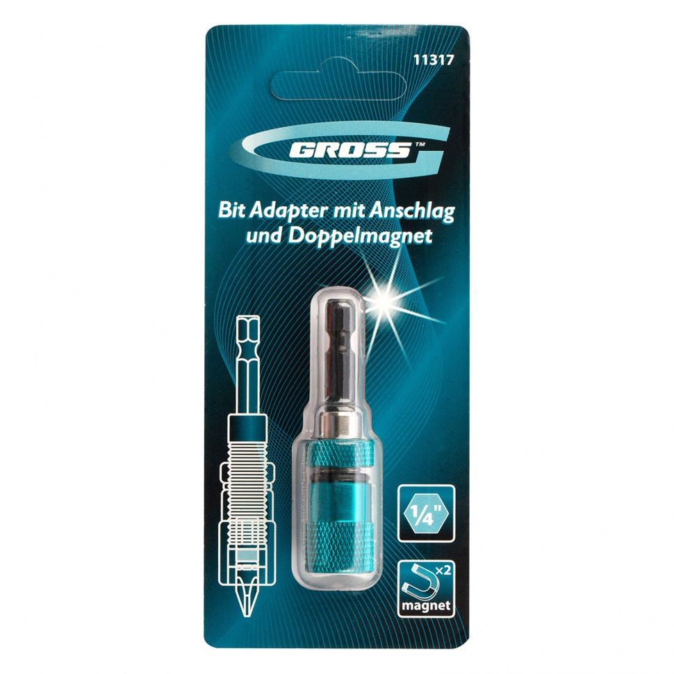 Адаптер для бит с ограничителем и двойным магнитом Gross 11317, 1/4 дюйма, обеспечивает уверенную фиксацию сменных насадок при работе с шуруповертами. Вставляется в патрон шуруповерта и позволяет быстро менять биты. Настраиваемый ограничитель глубины вкручивания предотвращает чрезмерное заглубление крепежа в гипсокартон и другие мягкие материалы и защищает их от повреждения.