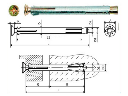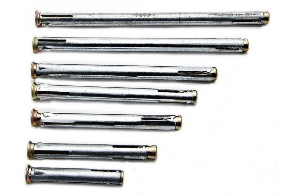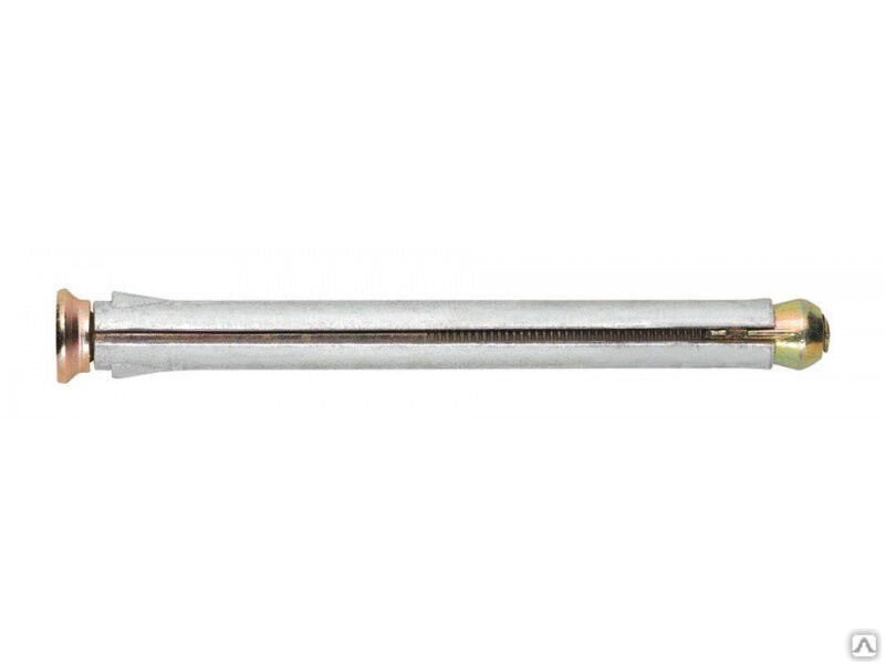 • Конструкция: основным элементом выступает втулка из металла с продольными прорезями, которые формируют рёбра и не дают ей провернуться при монтаже. Конусообразная гайка распирает эту втулку, что обеспечивает надёжное крепление.
