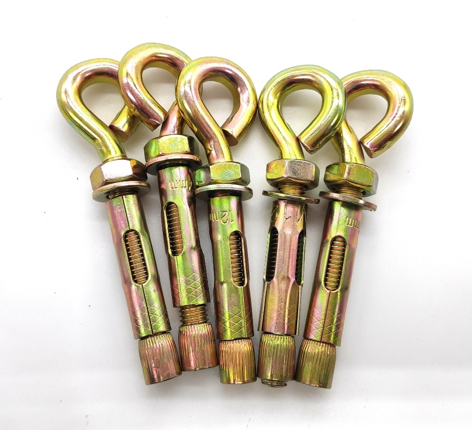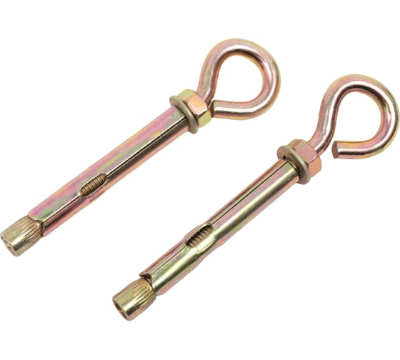 Конструкция: в основе анкера лежит шпилька из прочного металла с метрической резьбой, один конец которой выполнен в виде кольца, а второй содержит гайку в форме конуса. Тело втулки (распорной муфты) цилиндрической формы имеет продольные прорези, которые формируют до 4 лепестков. Также в конструкцию входит плоская шайба, которая обеспечивает равномерное распределение нагрузки на поверхность устанавливаемого элемента.