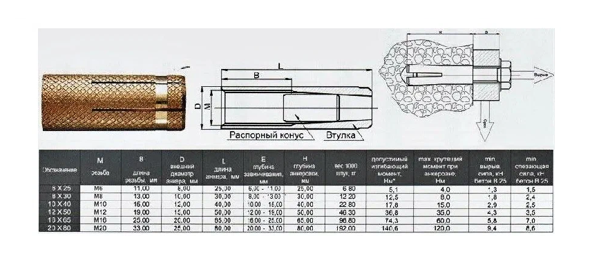 Принцип действия: анкер устанавливается в подготовленное отверстие соответствующего диаметра в материале. Прорези во втулке играют роль распорных плеч: в анкер забивается конусный распорный элемент, при этом лепестки втулки раскрываются и обеспечивают прочную фиксацию элемента в отверстии.