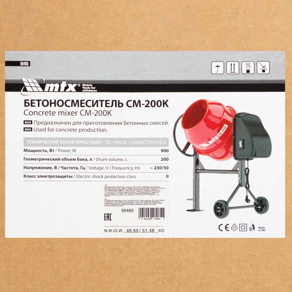 Бетоносмеситель в разборе - 1 шт, Комплект крепежа - 1 шт, Резиновая прокладка - 1 шт, Привод - 1 шт, Руководство по эксплуатации - 1 шт |
