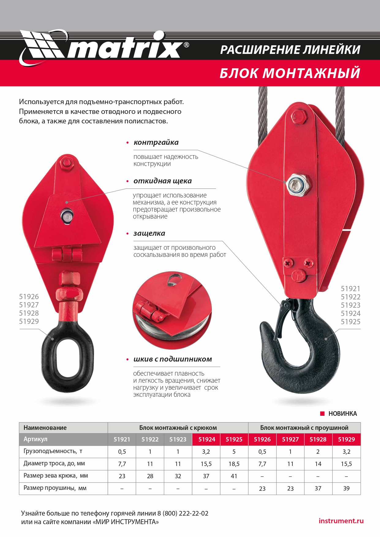 Монтажный блок с проушиной Matrix 51926 грузоподъемностью 0,5 т расширяет функциональные возможности ручного и электрического грузоподъемного оборудования. Он позволяет менять направление движения груза, а также увеличивает подъемную силу.