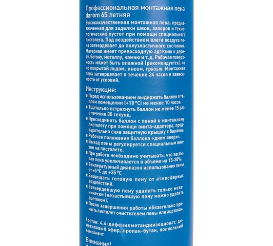 Полиуретановая зимняя монтажная пена Darom 65 – это высококачественный строительный материал, отлично проявляющий свои адгезивные свойства при высоких температурах воздуха. Данная монтажная пена поставляется в аэрозольном баллоне на 850 мл, объем готовой пены из которого при определенных условиях составляет до 65 литров.