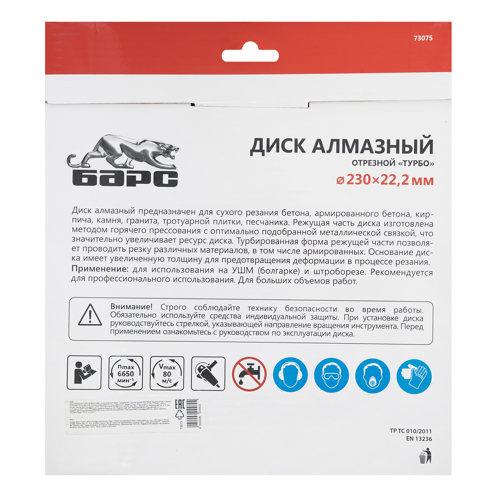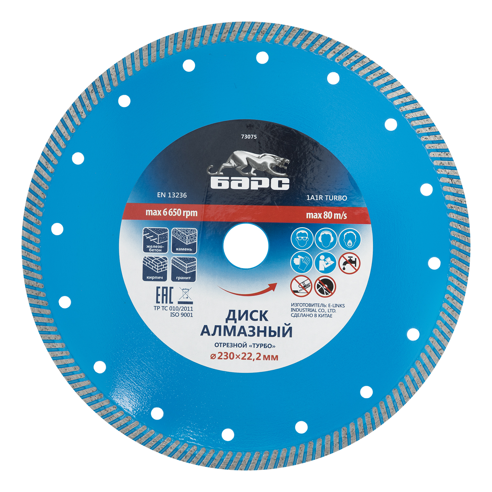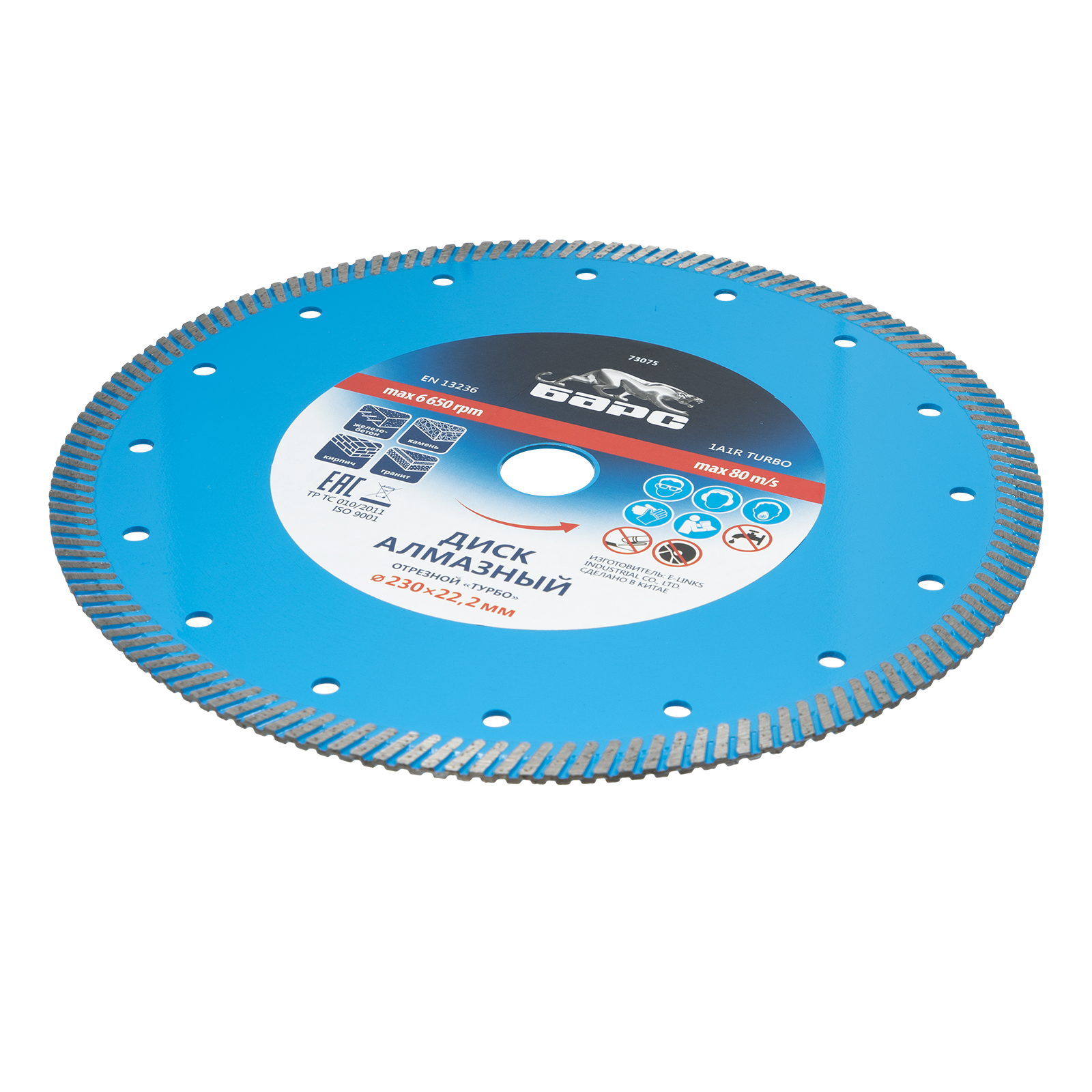 Алмазный диск Барс Турбо 73075 диаметром 230 х 22,2 мм предназначен для сухого резания бетона, в т.ч. свежего, среднеармированного железобетона, камня, кирпича, гранита и песчаника. Совместим с УШМ с посадочным диаметром 22,2 мм, используется для проведения строительных и ремонтных работ.
