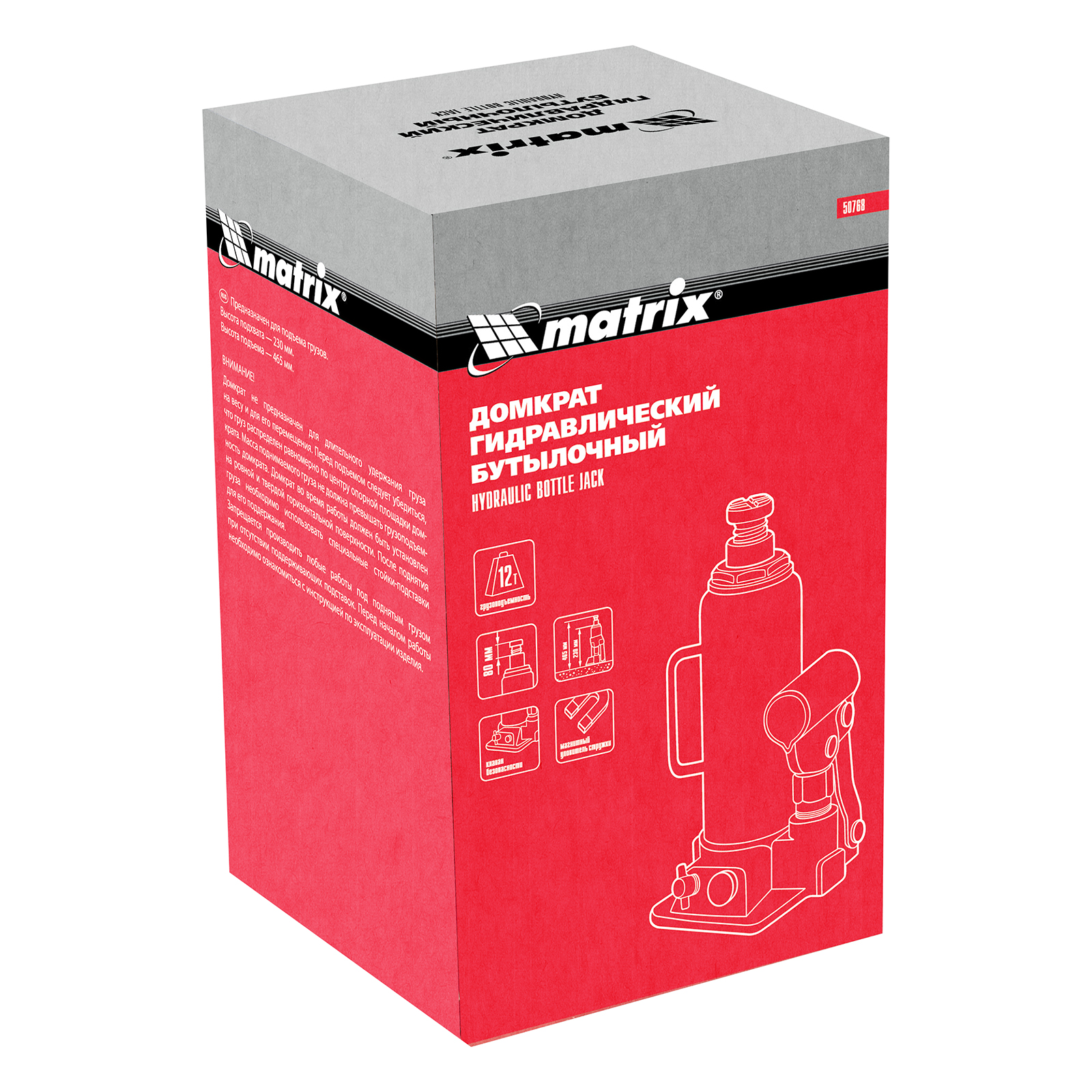 Гидравлический бутылочный домкрат Matrix 50768 предназначен для быстрого поднятия грузов массой до 12 т на высоту 230-465 мм. Будет полезен автолюбителям и мастерам СТО в качестве полупрофессионального инструмента. Встроенный магнитный уловитель металлической стружки защищает резиновые уплотнители от повреждений.