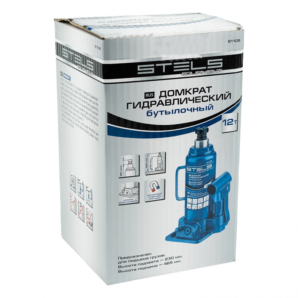 Гидравлический бутылочный домкрат Stels 51108 предназначен для поднятия грузов массой до 12 т на высоту с 230 до 465 мм. Позволяет установить жесткую опору под груз для последующего проведения ремонта. Будет полезен на станции техобслуживания, пригодится во время проведения ремонтно-строительных работ.