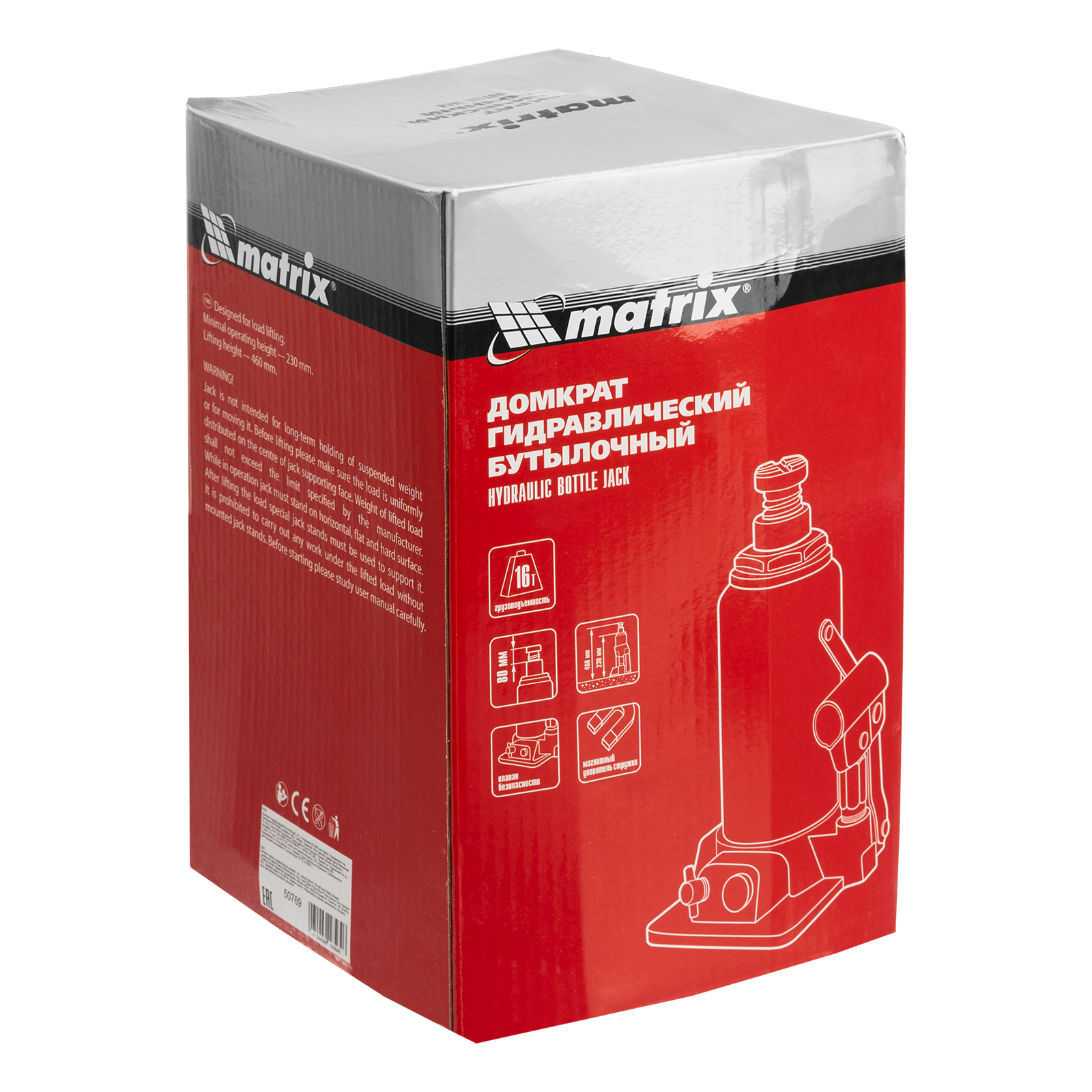 Гидравлический бутылочный домкрат Matrix 50769 предназначен для быстрого поднятия грузов массой до 16 т на высоту 230-460 мм. Будет полезен автолюбителям и мастерам СТО в качестве полупрофессионального инструмента. Встроенный магнитный уловитель металлической стружки защищает резиновые уплотнители от повреждений.