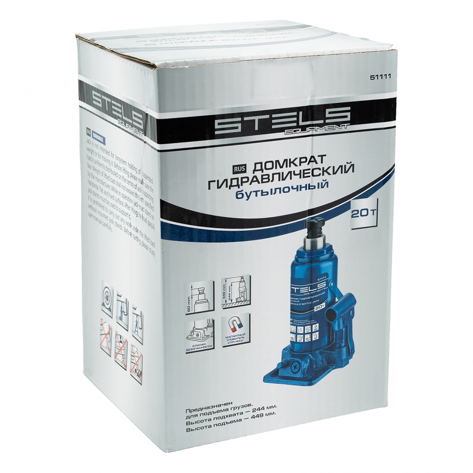 Гидравлический бутылочный домкрат Stels 51111 предназначен для поднятия грузов массой до 20 т на высоту с 244 до 449 мм. Позволяет установить жесткую опору под груз для последующего проведения ремонта. Будет полезен на станции техобслуживания, пригодится во время проведения ремонтно-строительных работ.