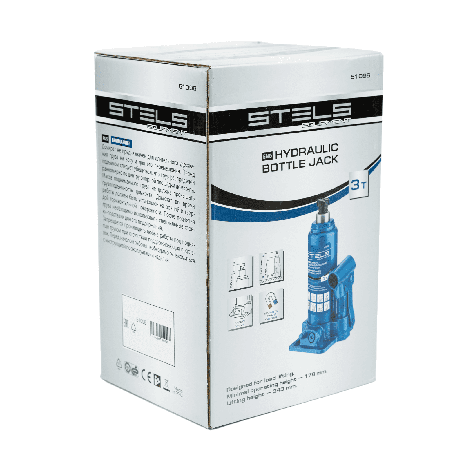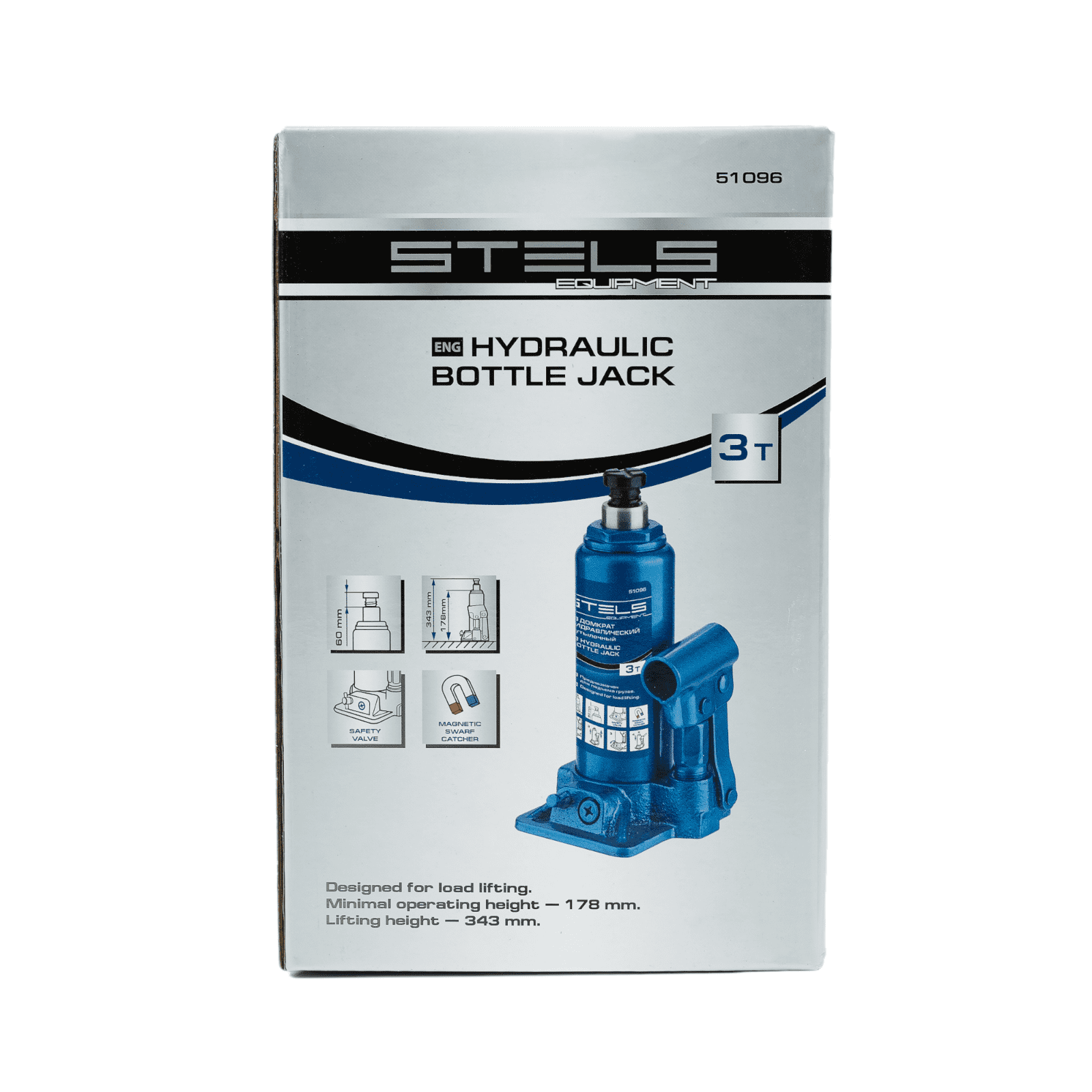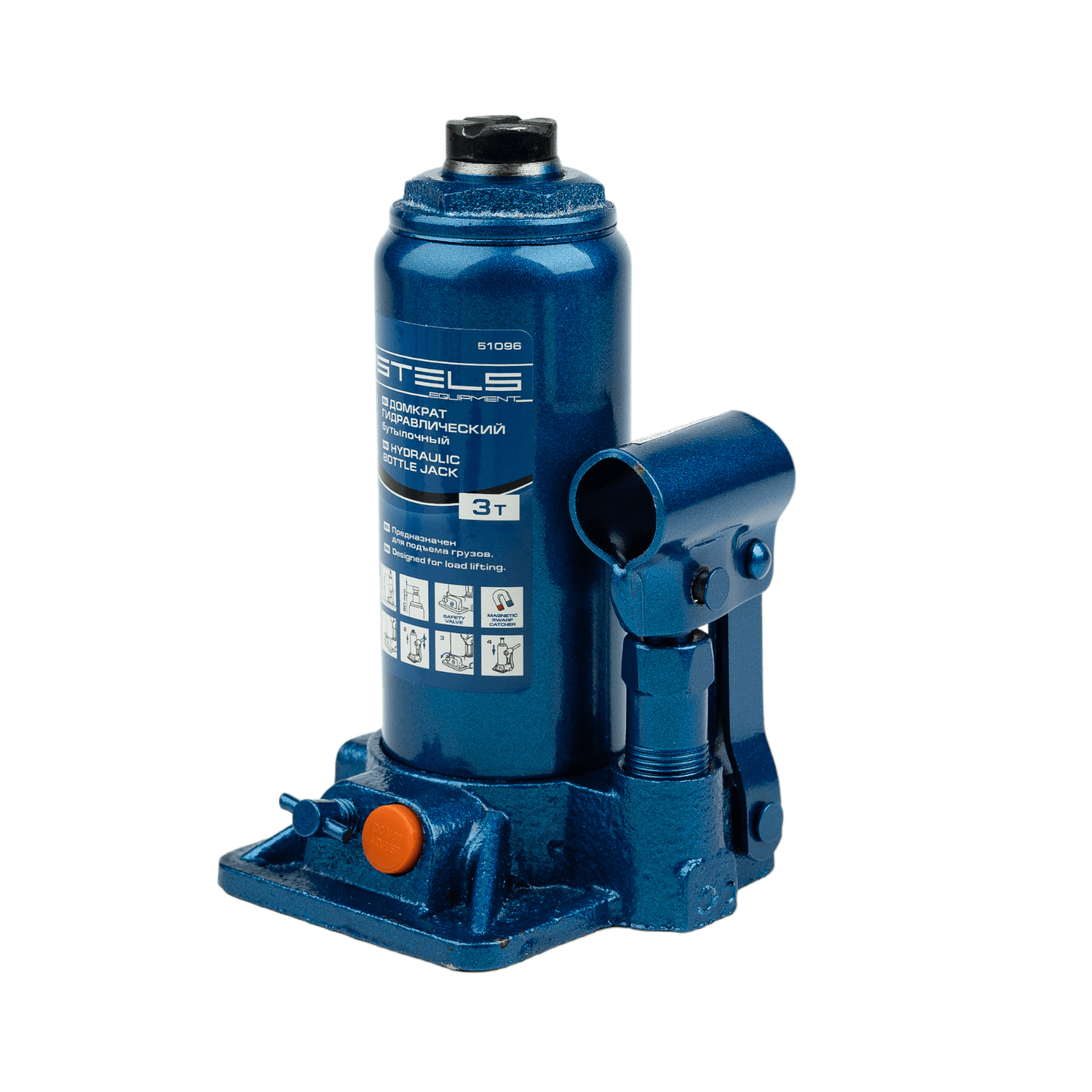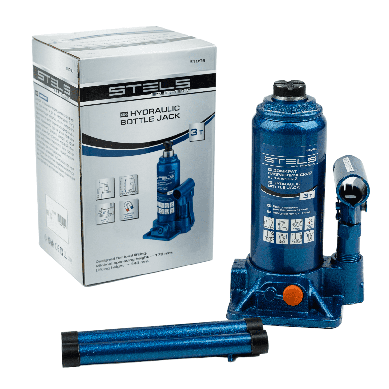 Гидравлический бутылочный домкрат Stels 51096 предназначен для поднятия грузов массой до 3 т на высоту со 178 до 343 мм. Позволяет установить жесткую опору под груз для последующего проведения ремонта. Будет полезен на станции техобслуживания, подойдет также для самостоятельного обслуживания автомобиля. Пригодится во время проведения ремонтно-строительных работ.
