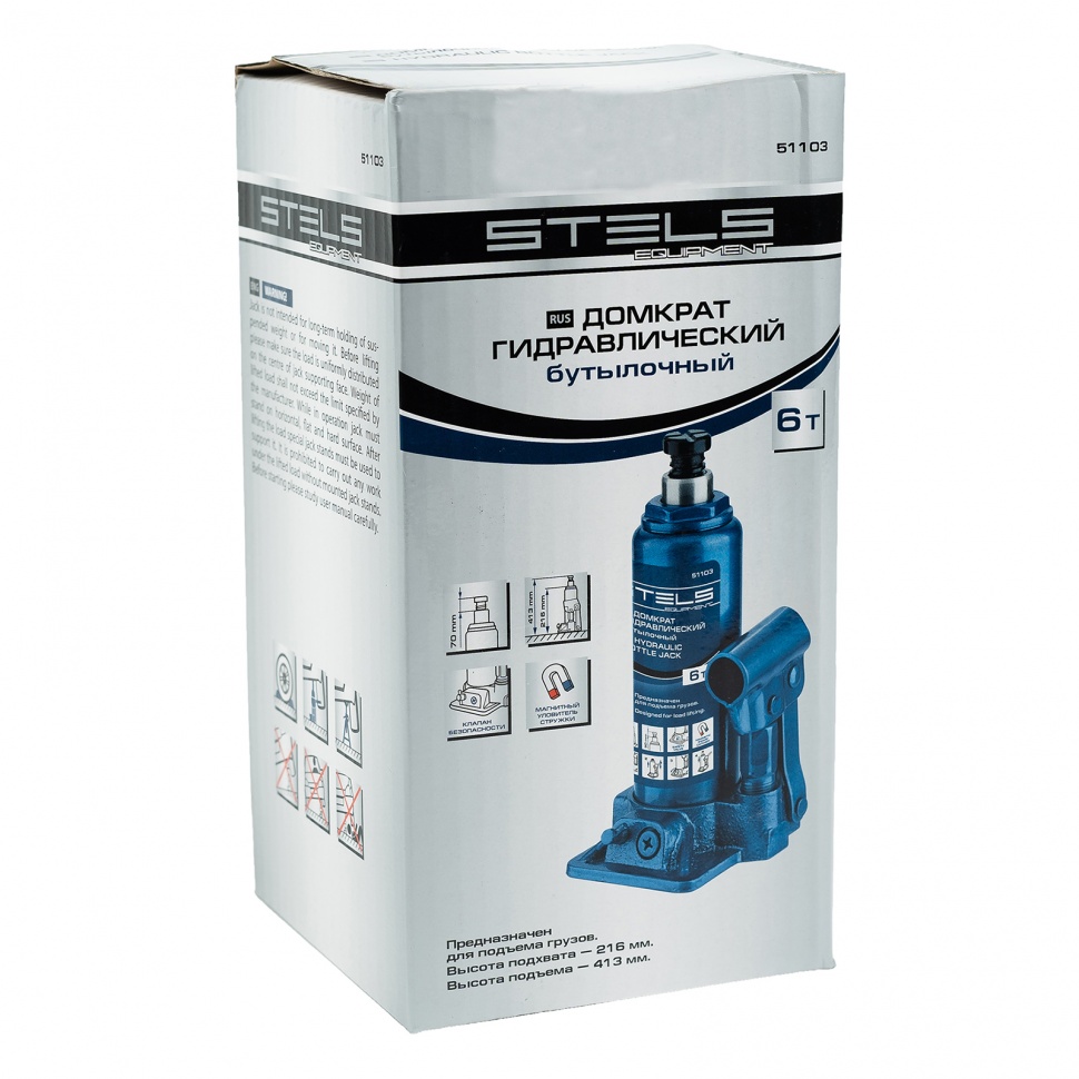 Гидравлический бутылочный домкрат Stels 51103 предназначен для поднятия грузов массой до 6 т на высоту с 216 до 413 мм. Позволяет установить жесткую опору под груз для последующего проведения ремонта. Будет полезен на станции техобслуживания, подойдет также для самостоятельного обслуживания автомобиля. Пригодится во время проведения ремонтно-строительных работ.