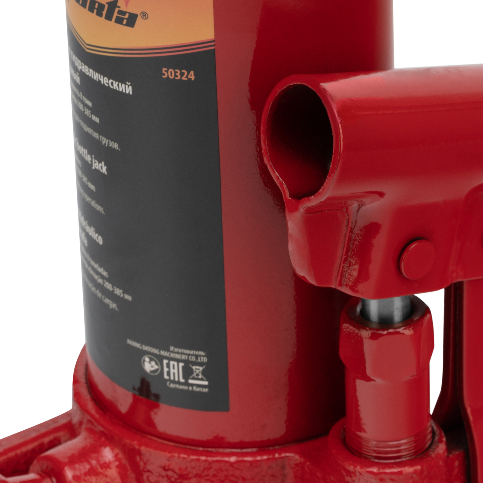 Гидравлический бутылочный домкрат Sparta 50324 рассчитан на подъем грузов весом до 8 т на высоту от 200 до 385 мм. Он пригодится как автолюбителям в гараже, так и профессиональным мастерам в автосервисах. Домкрат обеспечивает плавный подъем груза без особых усилий со стороны пользователя.