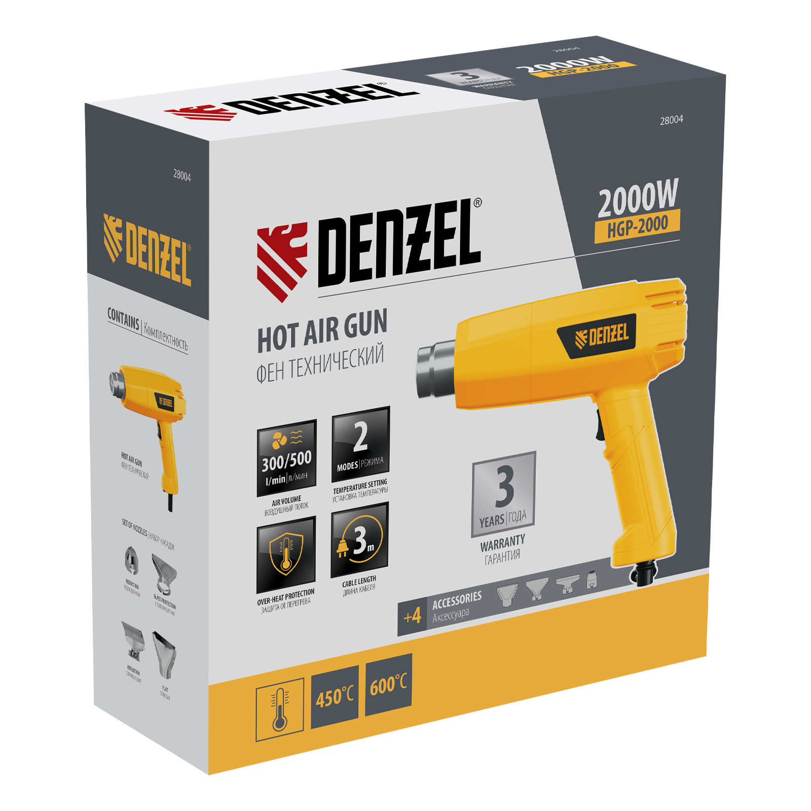 Фен технический 1 штНасадка плоская 1 штНасадка редукционная 1 штНасадка огибающая 1 штНасадка для защиты стекла 1 штРуководство по эксплуатации с гарантийным талоном 1 шт |