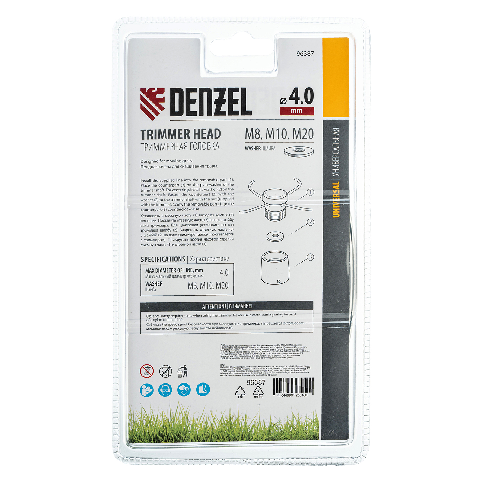 Универсальная быстрозажимная триммерная головка Denzel 96387, в комплекте с шайбами M8, M10, M20, предназначена для установки на электро- и бензотриммеры. Позволяет ухаживать за газоном и эффективно бороться с сорняками. Подходит для работы на местности со сложным рельефом. Используется для ухода за растительностью на дачном участке.