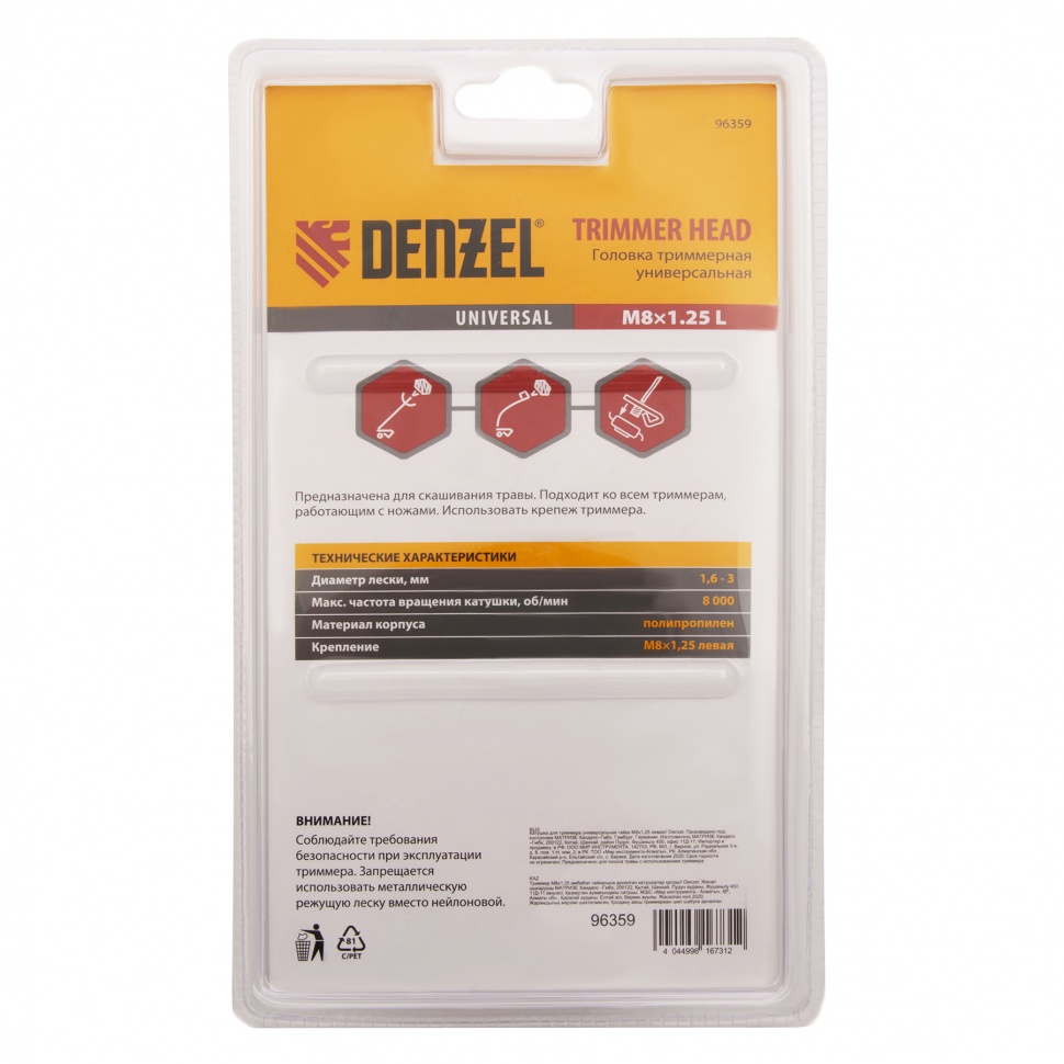 Универсальная триммерная головка Denzel 96359 с закладной гайкой М8 х 1,25 с левой резьбой подходит практически ко всем моделям электро- и бензокос. Заправляется режущей леской толщиной до 3 мм, поэтому эффективна как для подравнивания газона, так и для скашивания высоких зарослей травы.
