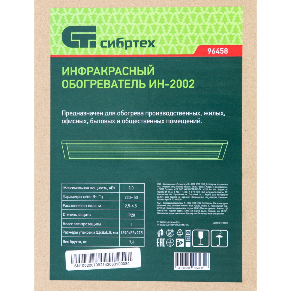 Инфракрасный обогреватель - 1 шт, Комплект кронштейнов - 1 шт, Руководство по эксплуатации и гарантийный талон - 1 шт |