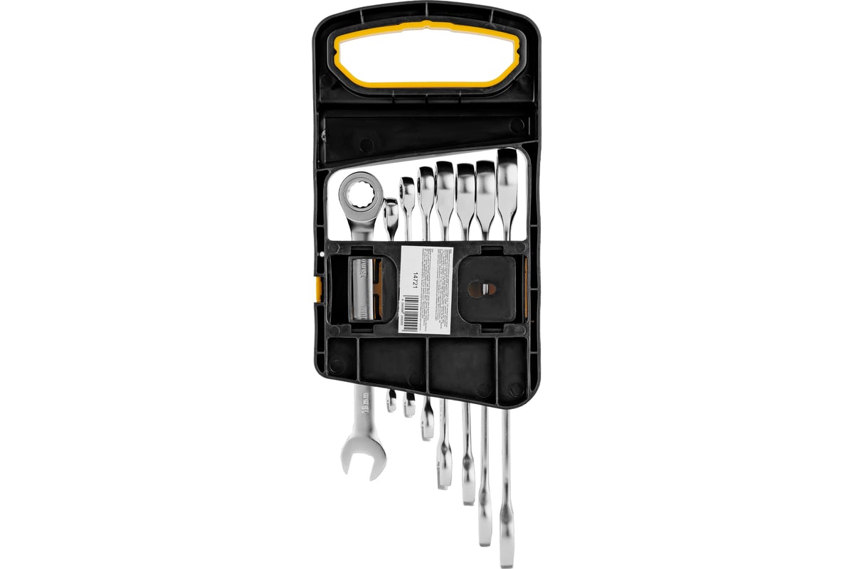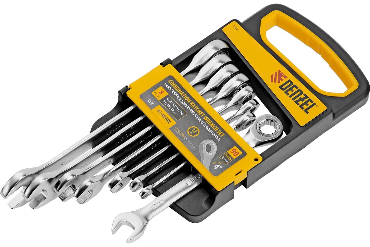 Набор комбинированных трещоточных ключей Denzel 14721 состоит из 8 инструментов из стали CrV, размером 6-19 мм, с покрытием «матовый хром». Используется для проведения монтажных и демонтажных работ с резьбовыми соединениями, в том числе в труднодоступных местах. У каждого ключа 2 рабочих профиля, что расширяет возможности использования набора. Инструменты пригодятся дома и в гараже.