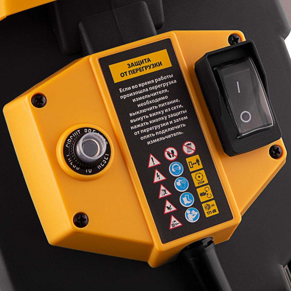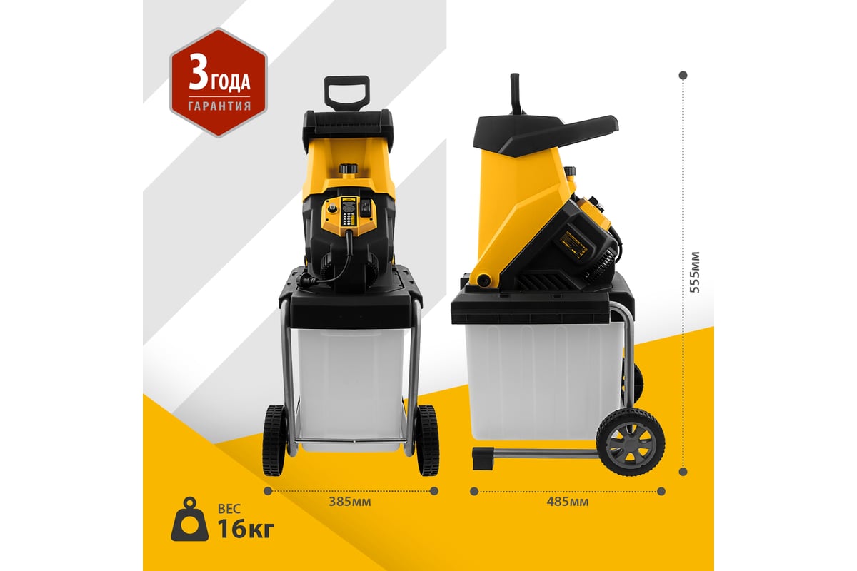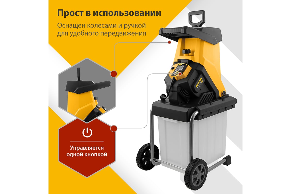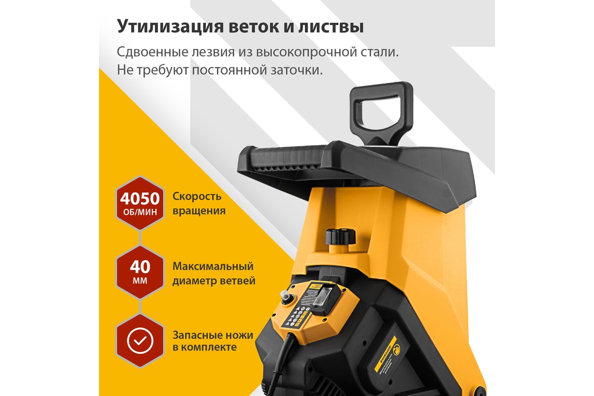 Измельчитель - 1 шт, Контейнер - 1 шт, Рама - 2 шт, Колеса с крепежом - 2 шт, Толкатель - 1 шт, Запасные ножи - 2 шт, Набор ключей - 1 компл, Руководство пользователя с гарантийным талоном - 1 шт |