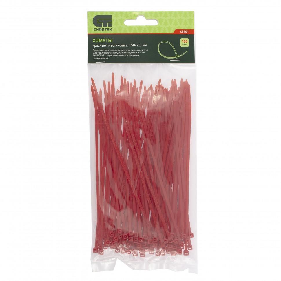 Красные пластиковые хомуты Сибртех 45501, 150 х 2,5 мм, 100 шт. в упаковке, используются для стяжки кабелей, закрепления трубок, шлангов, рекламных конструкций, а также для упаковки различных предметов. Пригодятся во время прокладки электрических и локальных вычислительных сетей, ремонта компьютерной техники, оформлении торговых стендов, комплектовании товара, будут также полезны дома, на даче и в гараже.