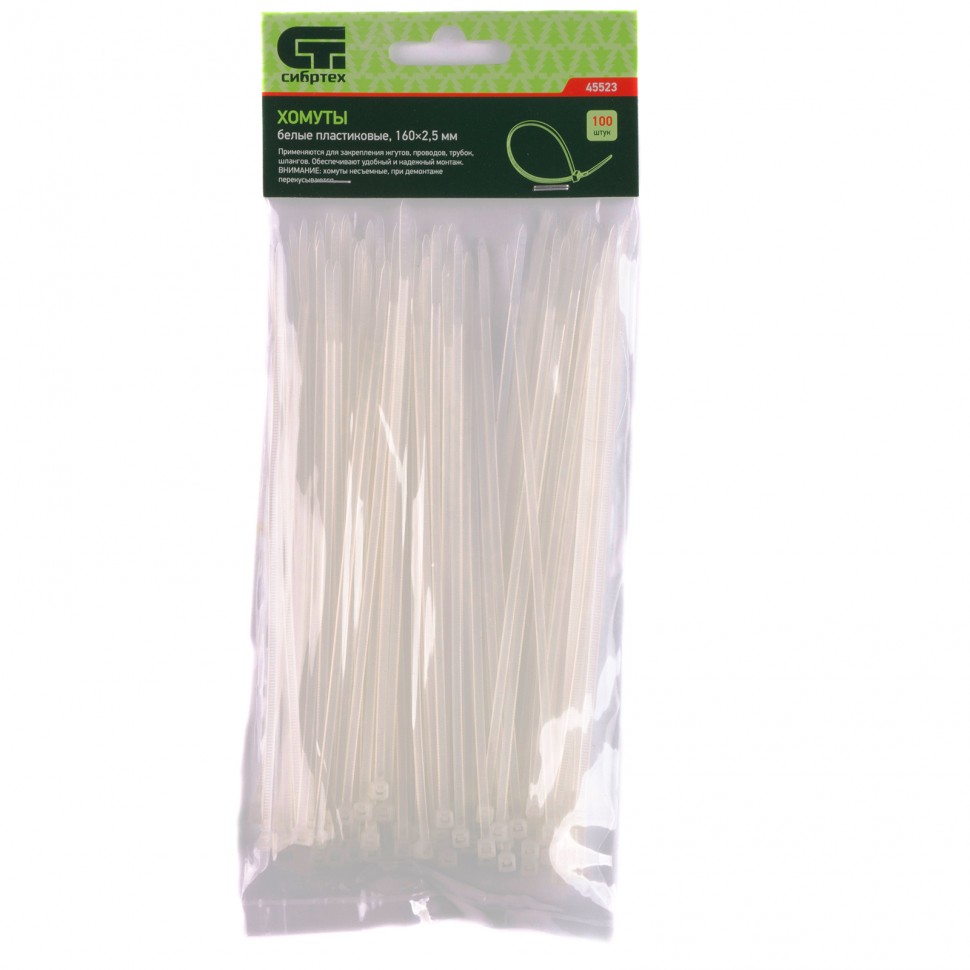 Белые пластиковые хомуты Сибртех 45523, 160 х 2,5 мм, 100 шт. в упаковке, используются для стяжки кабелей, закрепления трубок, шлангов, рекламных конструкций, а также для упаковки различных предметов. Пригодятся во время прокладки электрических и локальных вычислительных сетей, ремонта компьютерной техники, оформлении торговых стендов, комплектовании товара, будут также полезны дома, на даче и в гараже.