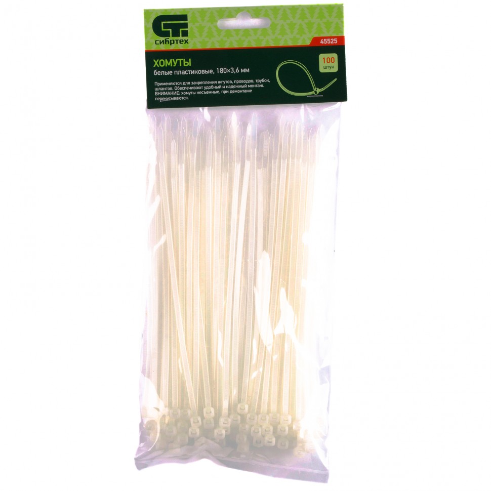 Белые пластиковые хомуты Сибртех 45525, 180 х 3,6 мм, 100 шт. в упаковке, используются для стяжки кабелей, закрепления трубок, шлангов, рекламных конструкций, а также для упаковки различных предметов. Пригодятся во время прокладки электрических и локальных вычислительных сетей, ремонта компьютерной техники, оформлении торговых стендов, комплектовании товара, будут также полезны дома, на даче и в гараже.