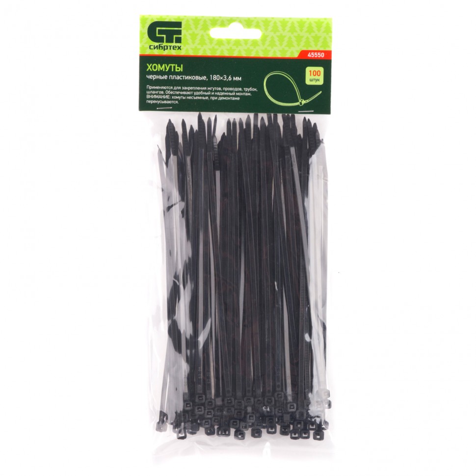 Черные пластиковые хомуты Сибртех 45550, 180 х 3,6 мм, 100 шт. в упаковке, используются для стяжки кабелей, закрепления трубок, шлангов, рекламных конструкций, а также для упаковки различных предметов. Пригодятся во время прокладки электрических и локальных вычислительных сетей, ремонта компьютерной техники, оформлении торговых стендов, комплектовании товара, будут также полезны дома, на даче и в гараже.