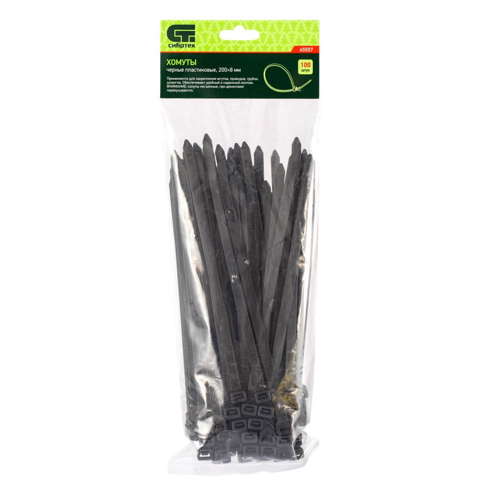 Черные пластиковые хомуты Сибртех 45557, 200 х 8 мм, 100 шт. в упаковке, используются для стяжки кабелей, закрепления трубок, шлангов, рекламных конструкций, а также для упаковки различных предметов. Пригодятся во время прокладки электрических и локальных вычислительных сетей, ремонта компьютерной техники, оформлении торговых стендов, комплектовании товара, будут также полезны дома, на даче и в гараже.