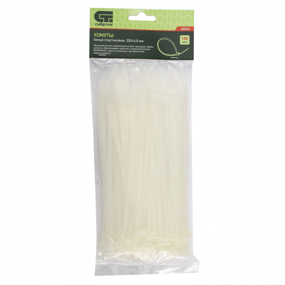 Белые пластиковые хомуты Сибртех 45534, 200 х 4,8 мм, 100 шт. в упаковке, используются для стяжки кабелей, закрепления трубок, шлангов, рекламных конструкций, а также для упаковки различных предметов. Пригодятся во время прокладки электрических и локальных вычислительных сетей, ремонта компьютерной техники, оформлении торговых стендов, комплектовании товара, будут также полезны дома, на даче и в гараже.