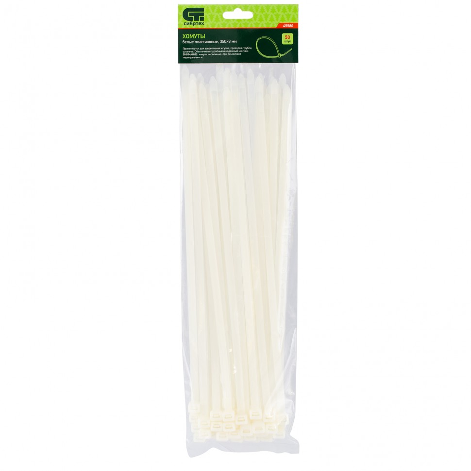 Белые пластиковые хомуты Сибртех 45580, 350 х 8 мм, 50 шт. в упаковке, используются для стяжки кабелей, закрепления трубок, шлангов, рекламных конструкций, а также для упаковки различных предметов. Пригодятся во время прокладки электрических и локальных вычислительных сетей, ремонта компьютерной техники, оформлении торговых стендов, комплектовании товара, будут также полезны дома, на даче и в гараже.