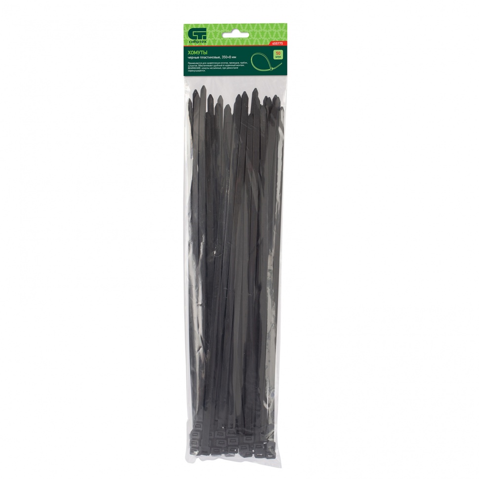 Черные пластиковые хомуты Сибртех 455775, 350 х 8 мм, 50 шт. в упаковке, используются для стяжки кабелей, закрепления трубок, шлангов, рекламных конструкций, а также для упаковки различных предметов. Пригодятся во время прокладки электрических и локальных вычислительных сетей, ремонта компьютерной техники, оформлении торговых стендов, комплектовании товара, будут также полезны дома, на даче и в гараже.
