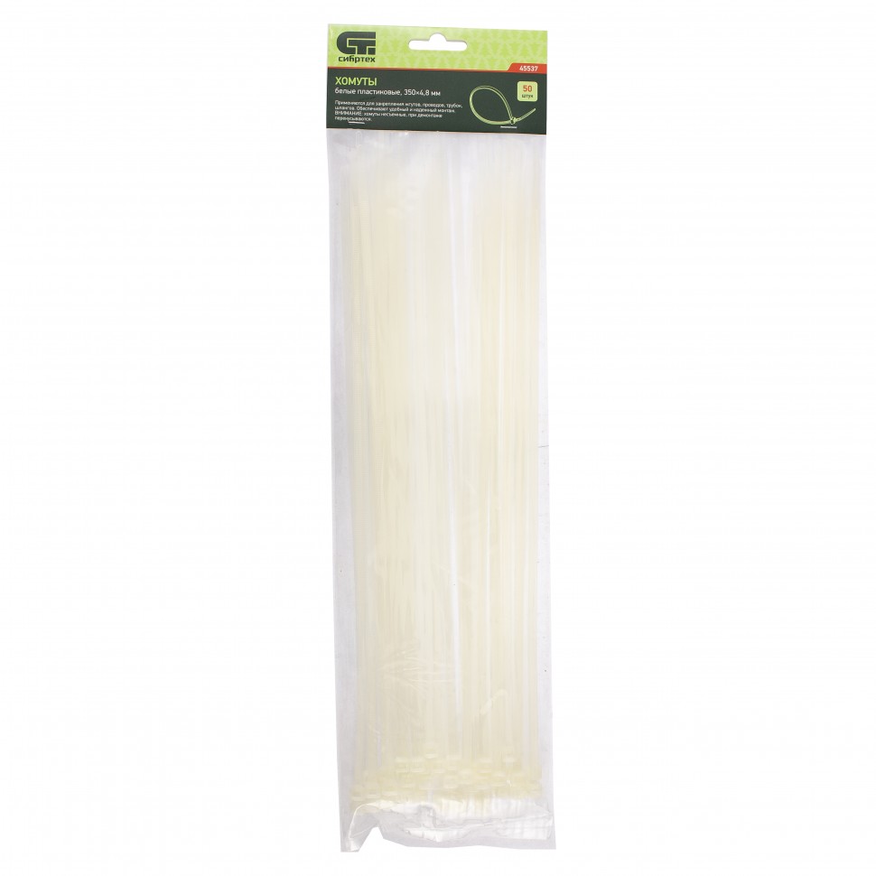 Белые пластиковые хомуты Сибртех 45537, 350 х 4,8 мм, 50 шт. в упаковке, используются для стяжки кабелей, закрепления трубок, шлангов, рекламных конструкций, а также для упаковки различных предметов. Пригодятся во время прокладки электрических и локальных вычислительных сетей, ремонта компьютерной техники, оформлении торговых стендов, комплектовании товара, будут также полезны дома, на даче и в гараже.