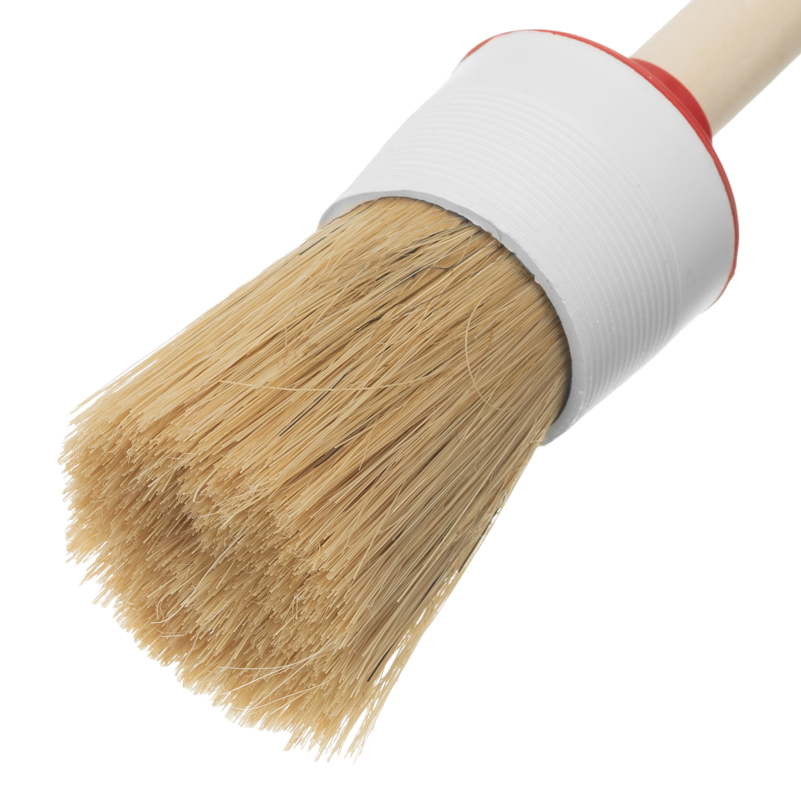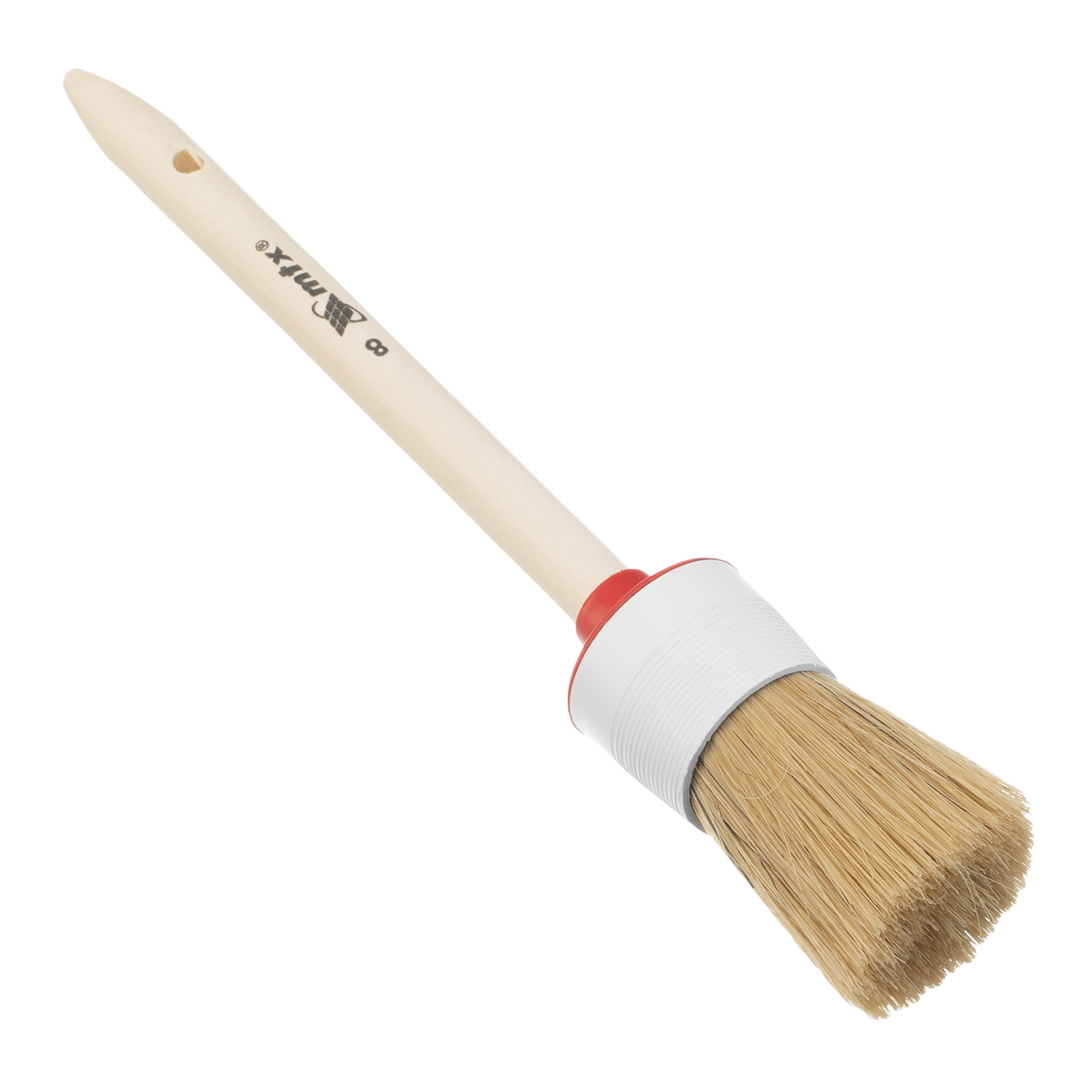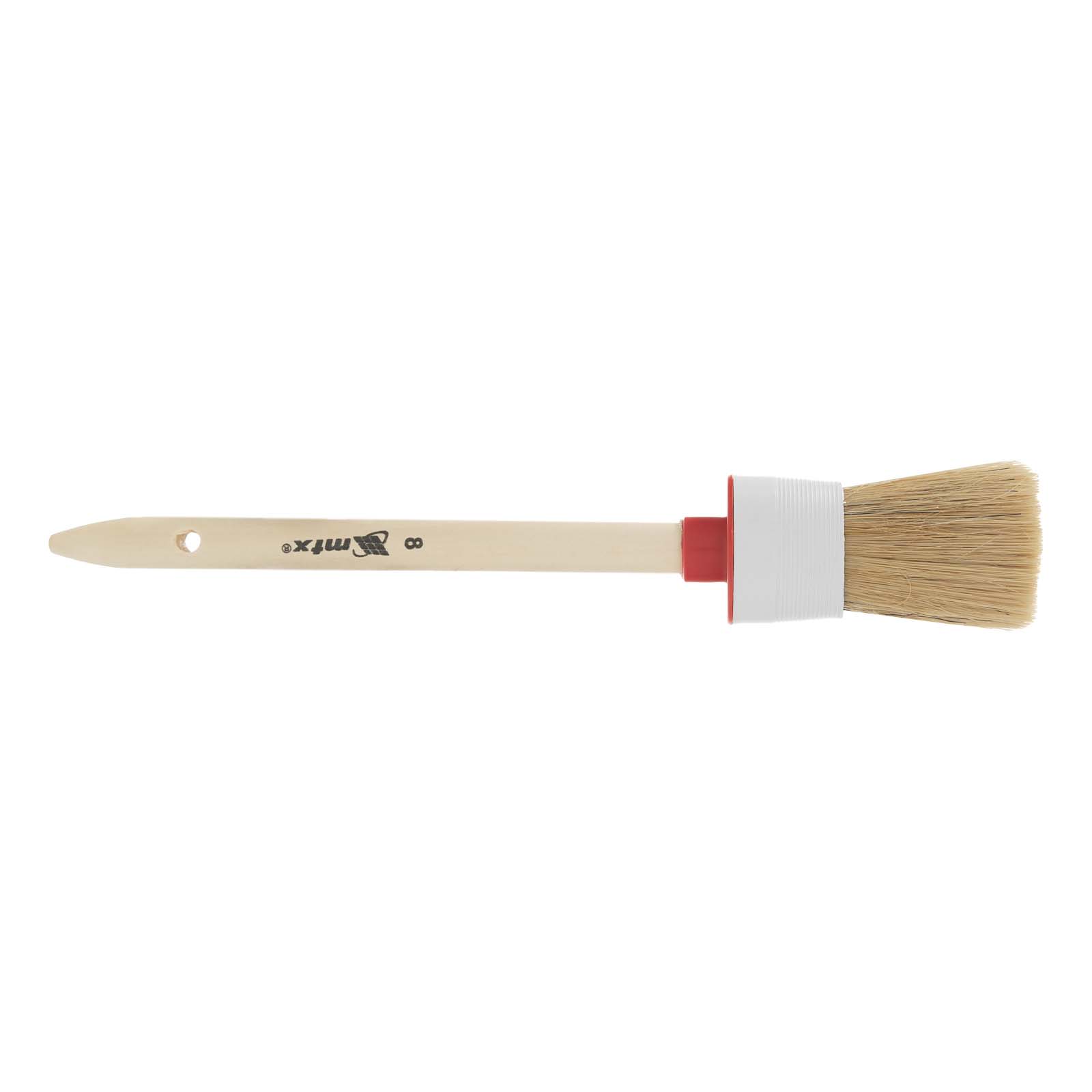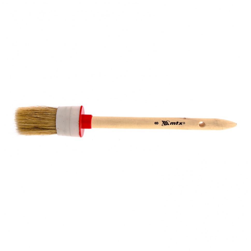 Круглая кисть MTX №8 82078 диаметром 35 мм, с натуральной щетиной и деревянной ручкой, пригодится в быту для окрашивания узких длинных поверхностей. Светлая натуральная свиная щетина с добавлением искусственной обладает высокой износоустойчивостью и может использоваться для нанесения красок с содержанием растворителей, а также масляных красок и лаков.