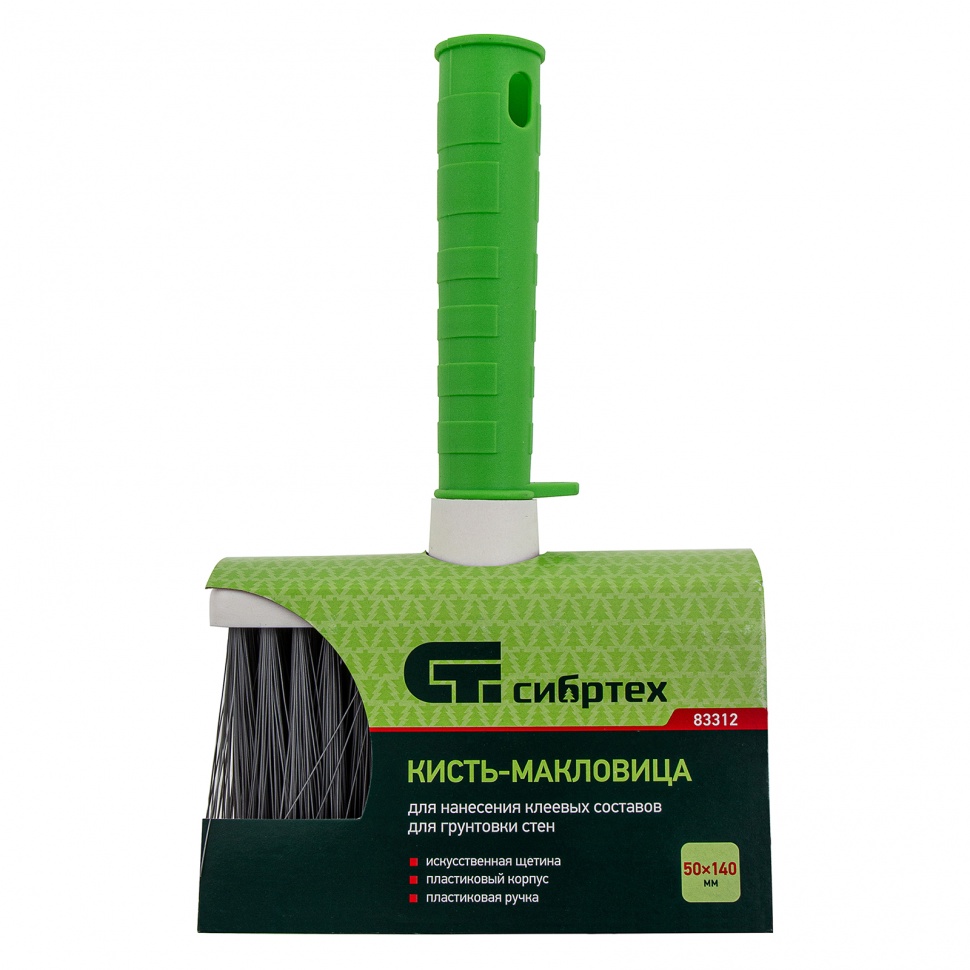 Кисть-макловица Сибртех 83312 толщиной 50 мм и шириной 140 мм, с искусственной щетиной, пластиковым корпусом и пластиковой ручкой, используется для нанесения на поверхности грунтовки, водно-дисперсионной краски, побелки, обойного клея, морилки. Подходит для обработки участков большой площади. Искусственная щетина с расщепленными на концах ворсинками хорошо набирает и удерживает лакокрасочные материалы, не деформируется в ходе работы.