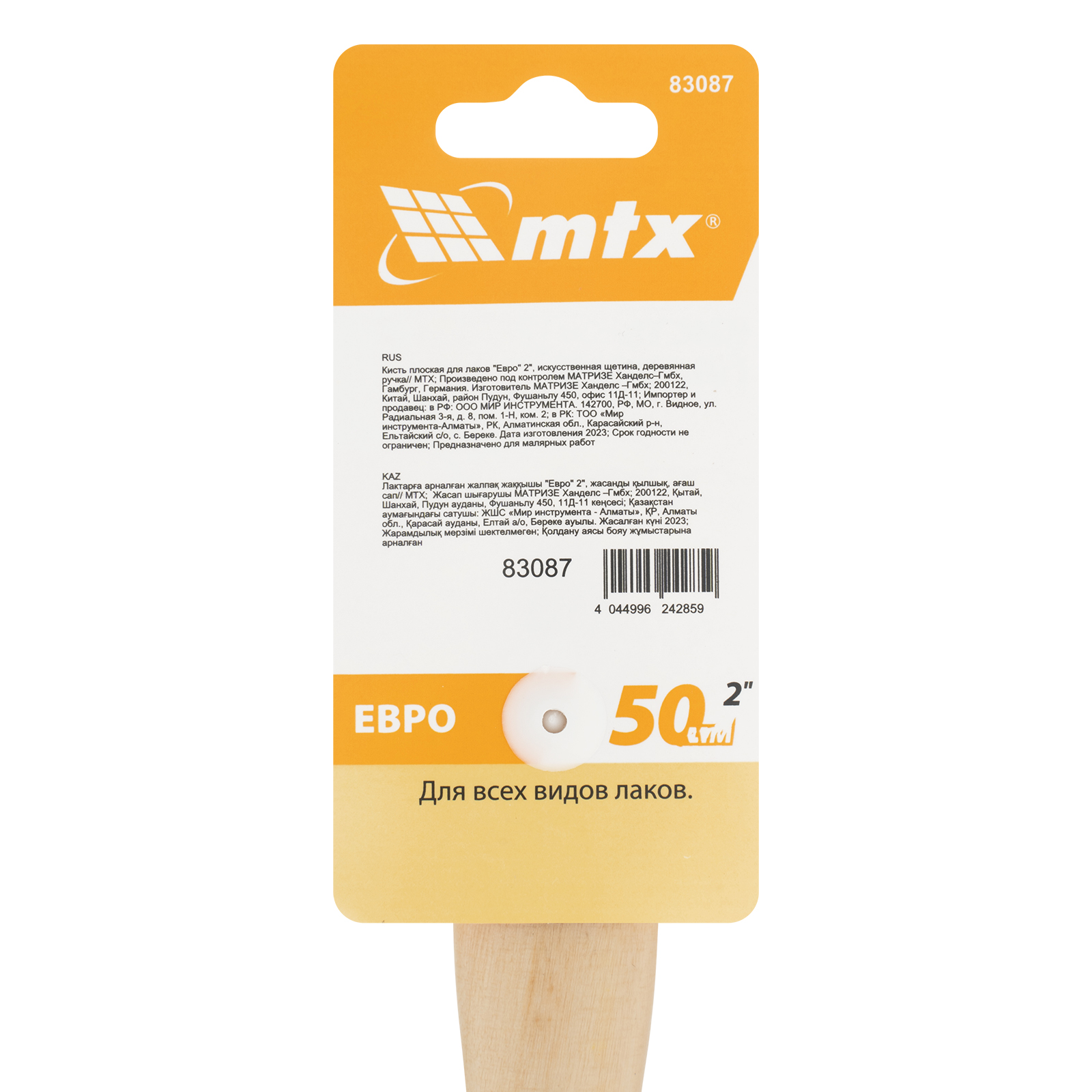 Кисть плоская MTX «Евро» 83087 шириной 2", с искусственной щетиной и деревянной ручкой, пригодится при проведении малярных работ. Предназначена для работы с любыми типами лаков. Мягкая и упругая щетина оптимальна для нанесения покрытий на гладкие и слегка шероховатые поверхности.
