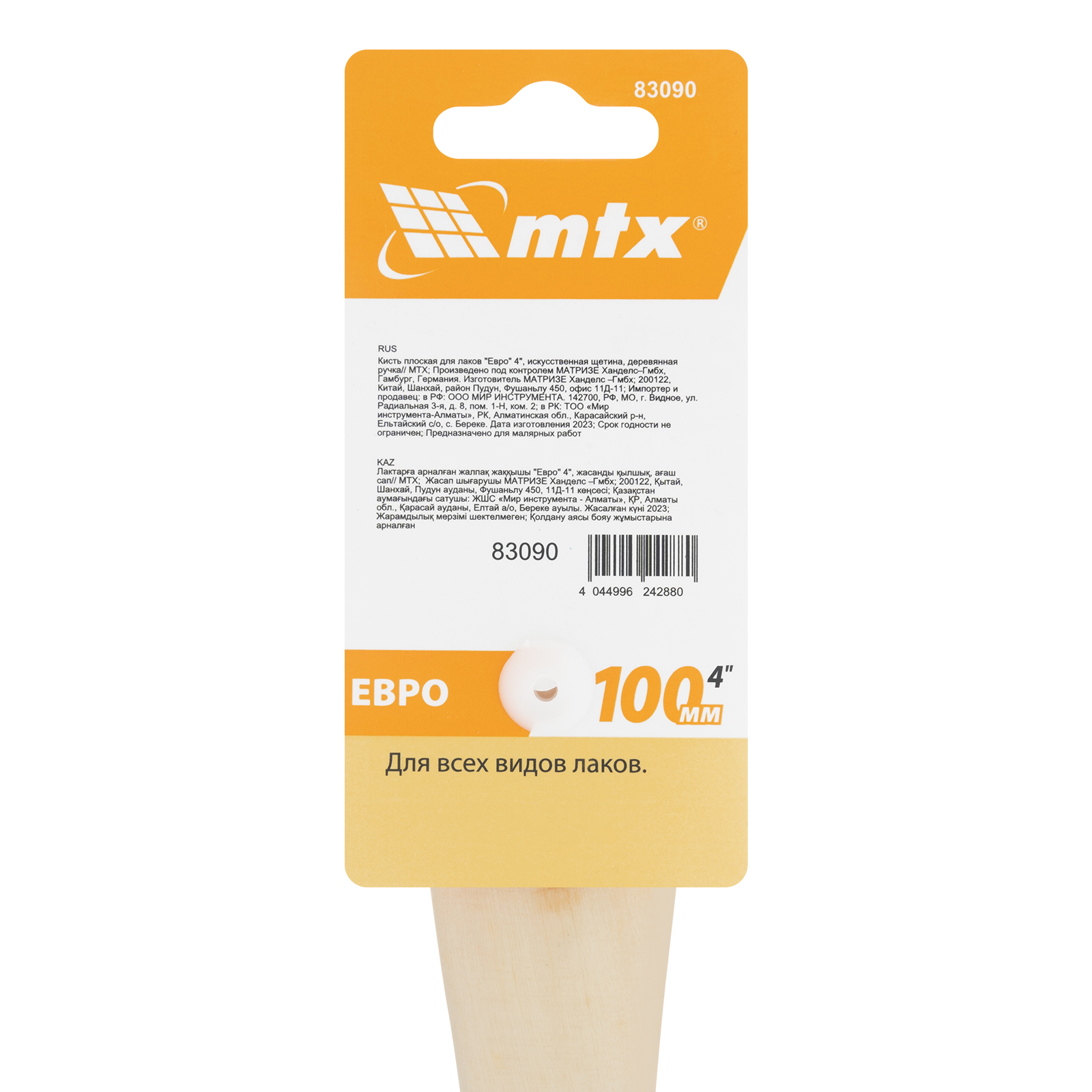 Кисть плоская MTX «Евро» 83090 шириной 4", с искусственной щетиной и деревянной ручкой, пригодится при проведении малярных работ. Предназначена для работы с любыми типами лаков. Мягкая и упругая щетина оптимальна для нанесения покрытий на гладкие и слегка шероховатые поверхности.