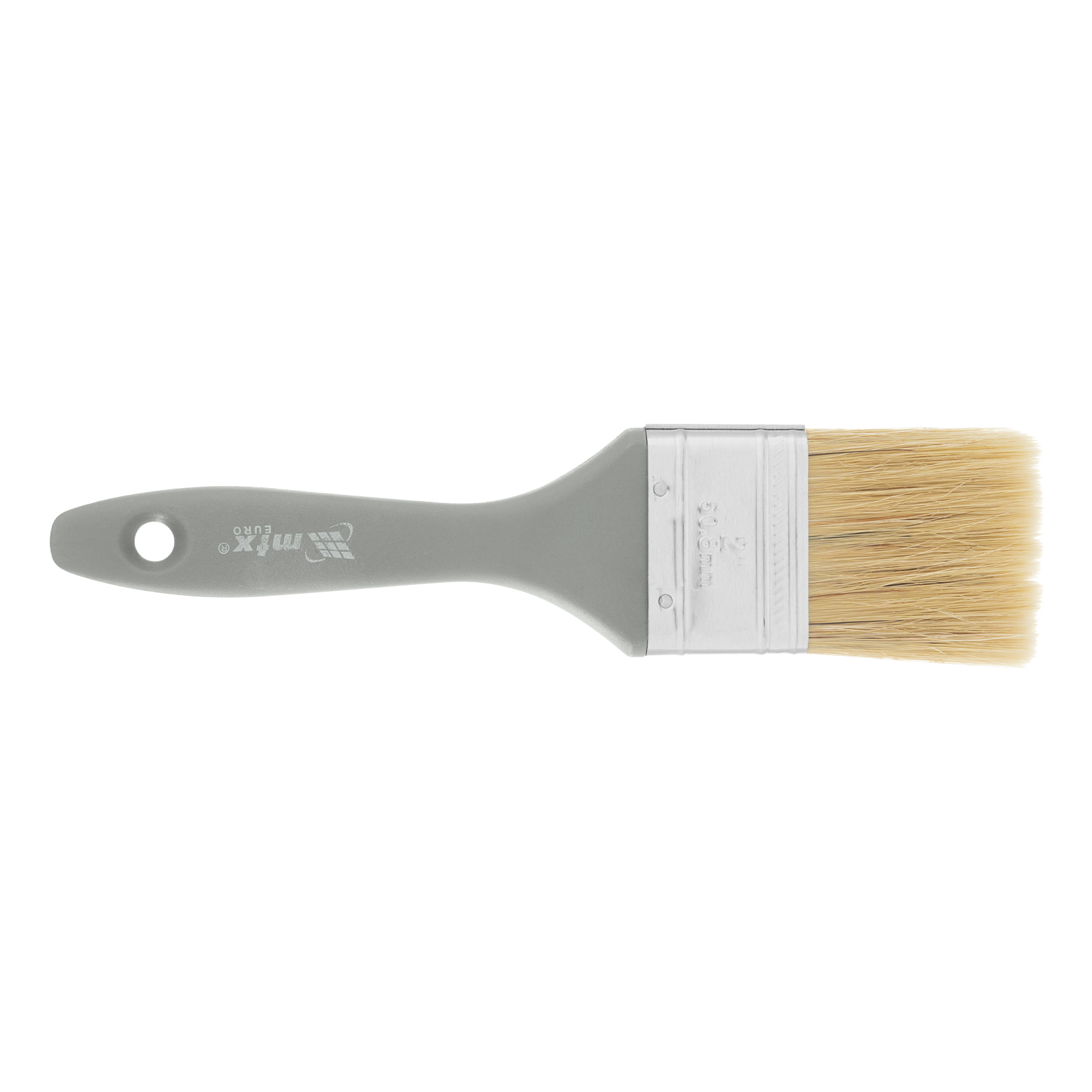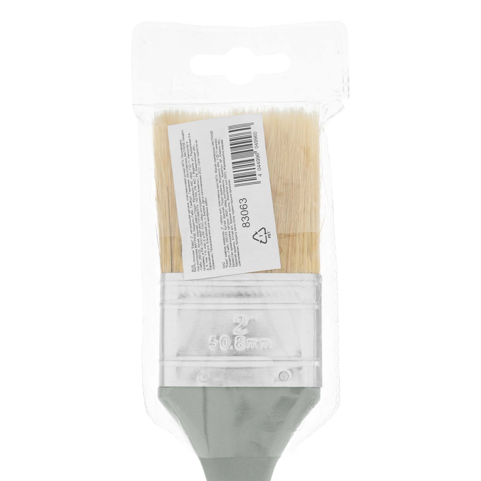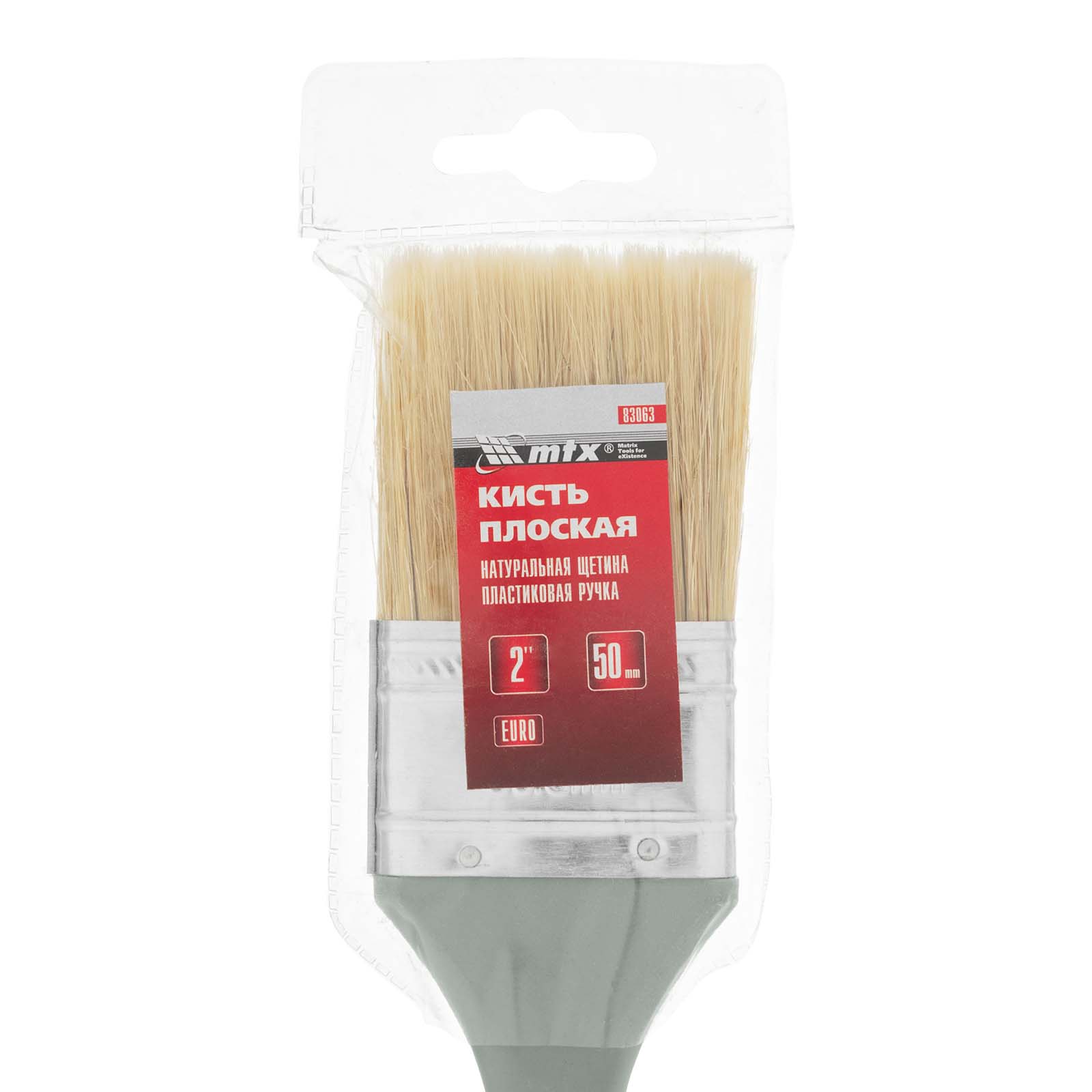 Плоская кисть MTX «Евро» 83063 шириной 2 дюйма, с натуральной щетиной и пластмассовой ручкой, используется для профессионального окрашивания поверхностей. Рекомендуется для нанесения агрессивных ЛКМ с содержанием растворителей.