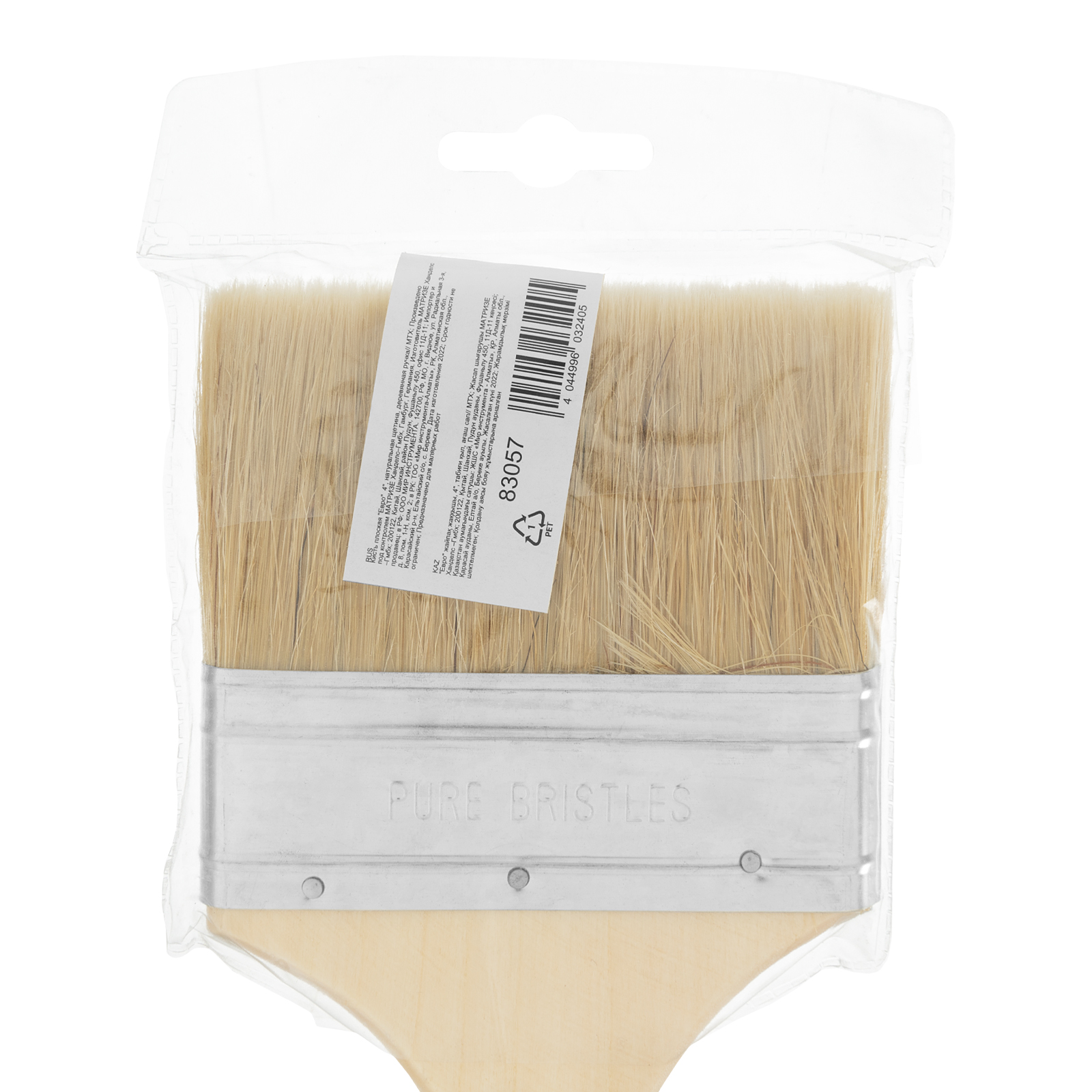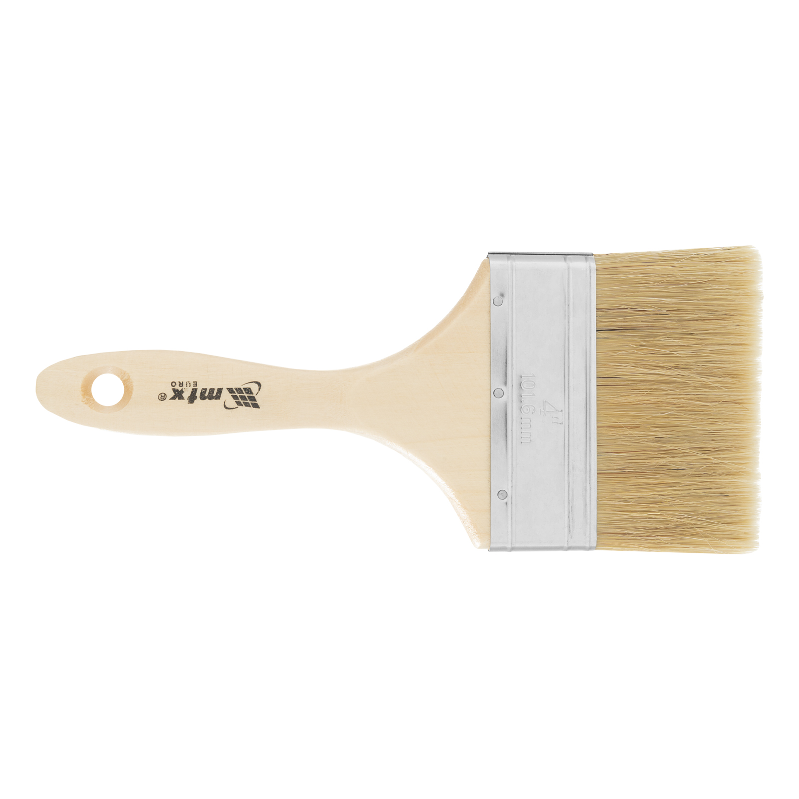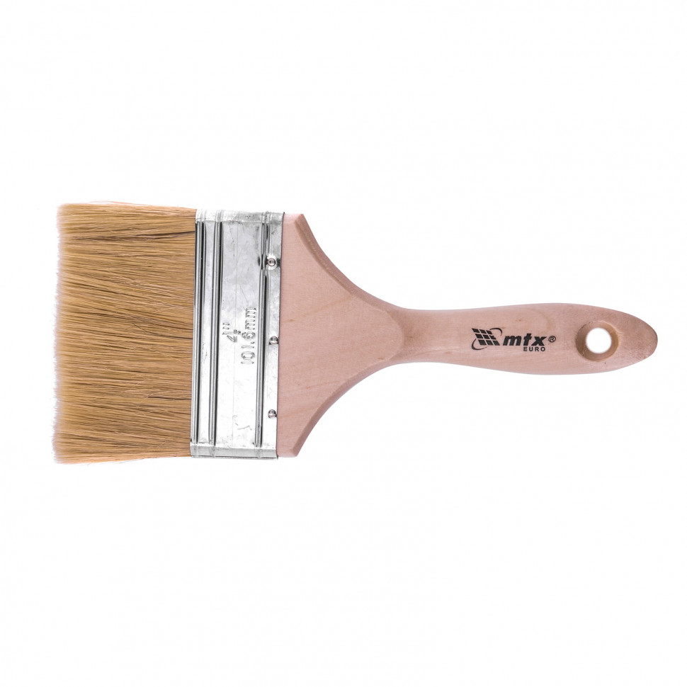 Плоская кисть MTX «Евро» 83057 шириной 4 дюйма, с натуральной щетиной и деревянной ручкой, используется для профессионального окрашивания поверхностей. Рекомендуется для нанесения агрессивных ЛКМ с содержанием растворителей.