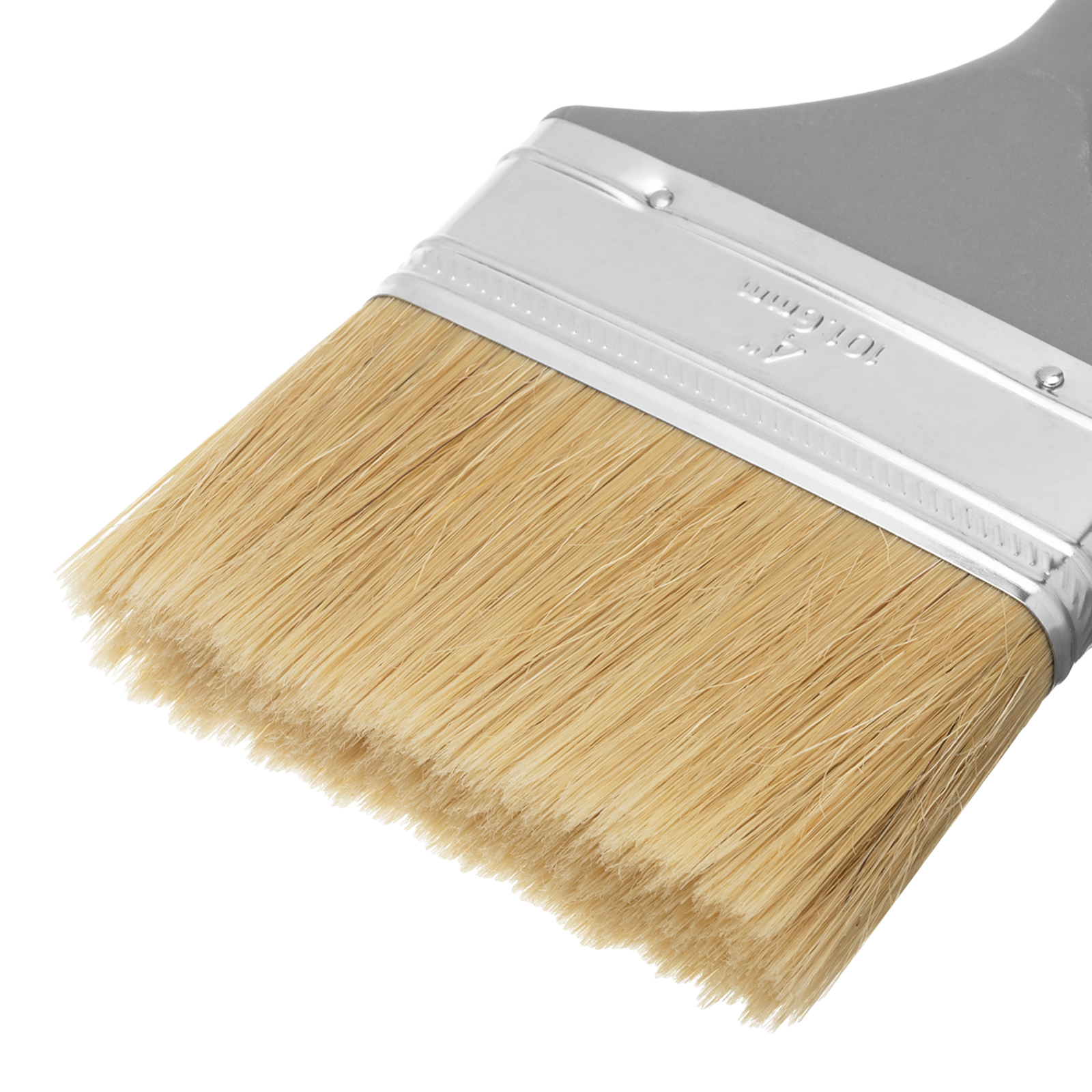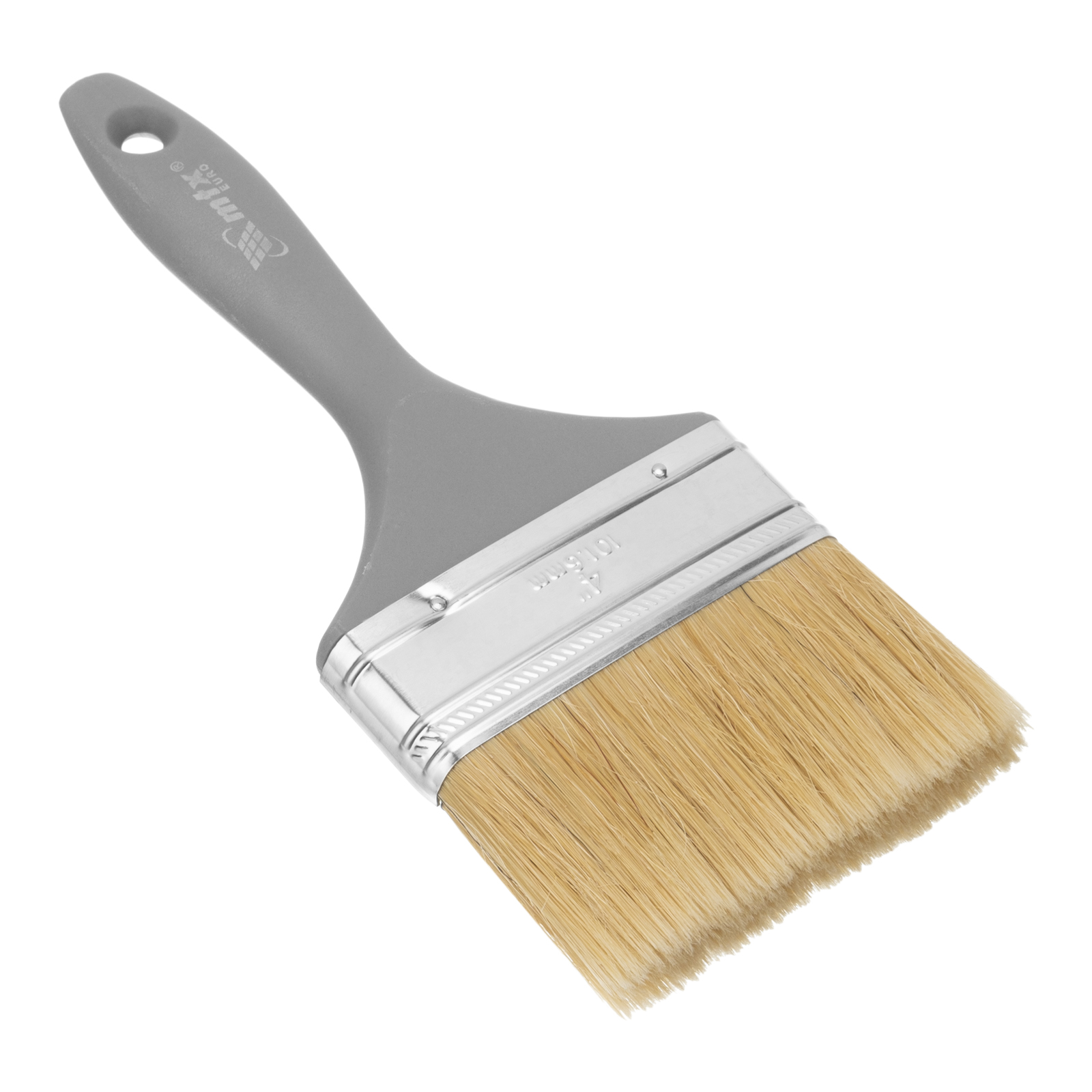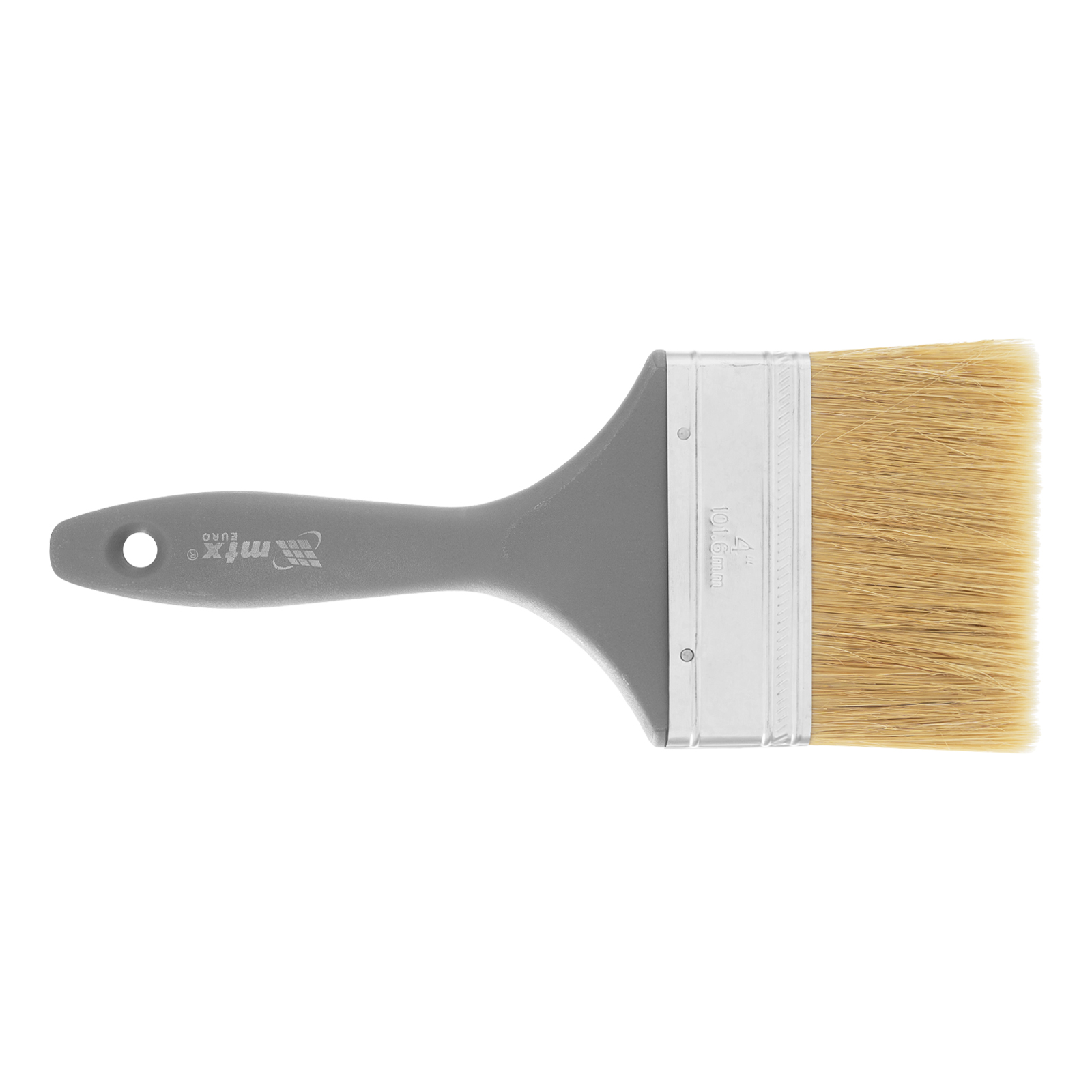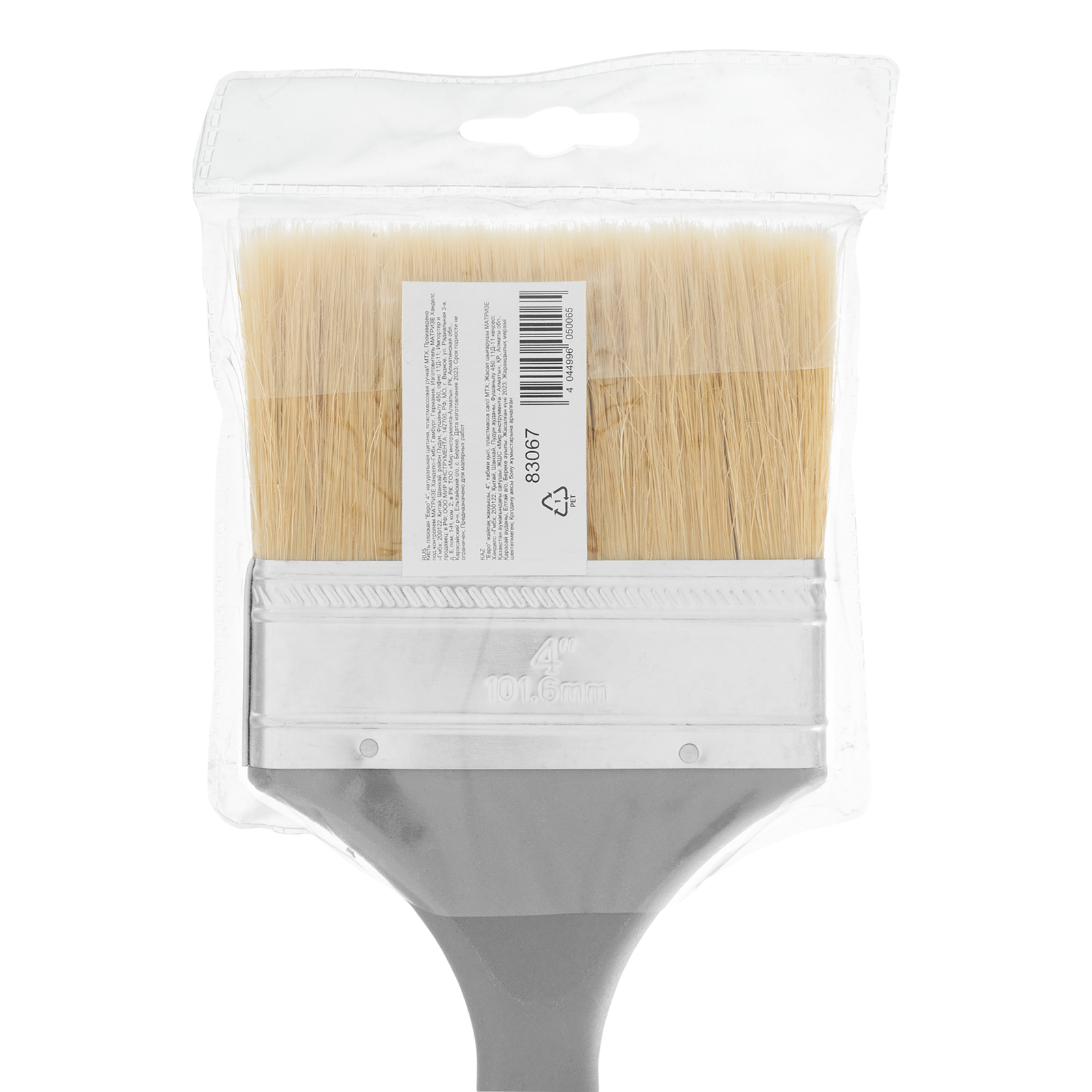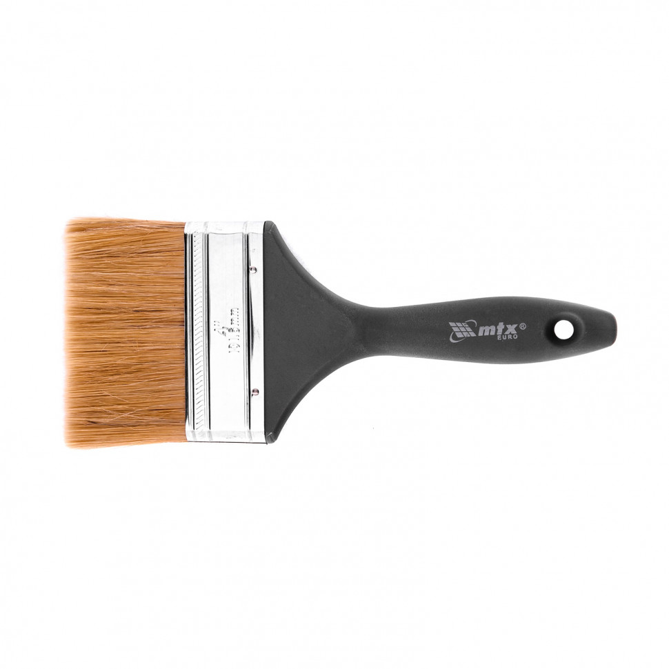 Плоская кисть MTX «Евро» 83067 шириной 4 дюйма, с натуральной щетиной и пластмассовой ручкой, используется для профессионального окрашивания поверхностей. Рекомендуется для нанесения агрессивных ЛКМ с содержанием растворителей.