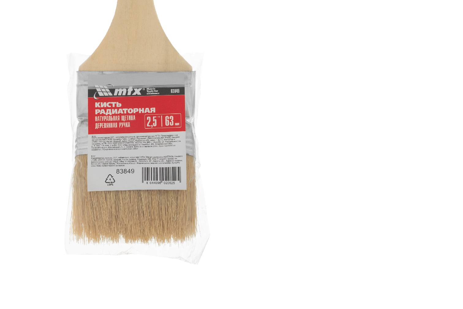 Радиаторная кисть MTX 83849 шириной 2,5", с натуральной щетиной и деревянной ручкой, используется для окрашивания радиаторов водяного отопления, металлических проволочных конструкций, труб, а также углов и стыков стен. Решение этих задач облегчает удлиненная ручка изогнутой формы. Натуральная щетина устойчива к агрессивным средам, поэтому кисть может применяться с эмалями и масляными красками.