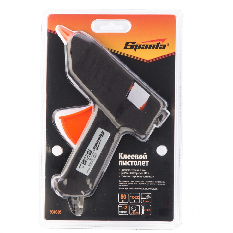 Клеевой пистолет Sparta 930305 мощностью 80 W работает от сети 220 V и совместим со стержнями диаметром 11 мм. Используется для проведения несложных бытовых работ: склеивания бумаги, дерева, пластика и других материалов. Инструмент пригодится частным мастерам при мелком ремонте, упаковке, сборке различных моделей и рукоделии.