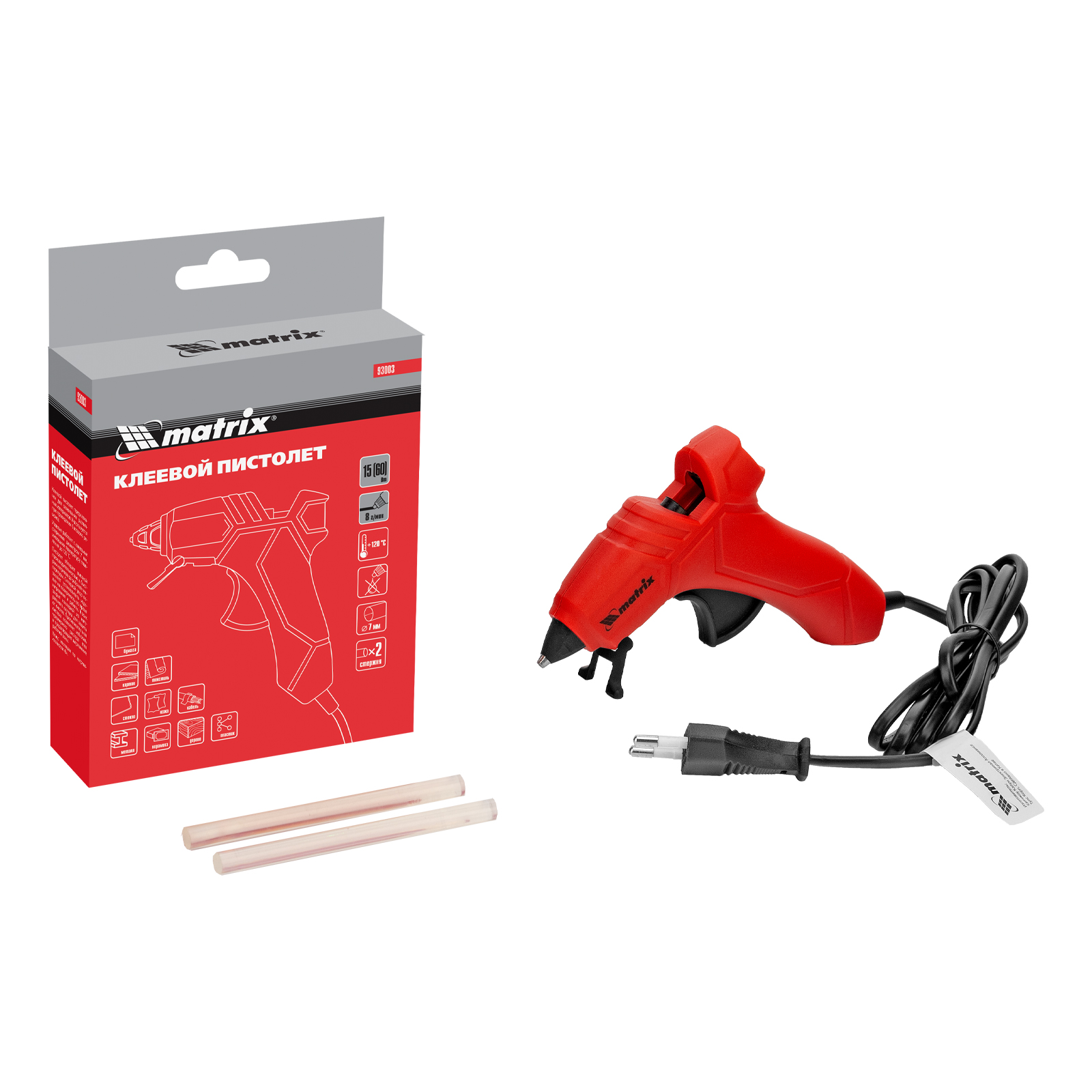 Клеевой пистолет Matrix 93003, 7 мм, используется для бытовых и полупрофессиональных нужд: мелкого ремонта, упаковки товаров, фиксации деталей, создания игрушек и объемных украшений, декорирования и т.д. Инструмент пригодится отделочникам, моделистам и тем, кто занимается хенд-мейдом. Он выдает 8 г клея в минуту.