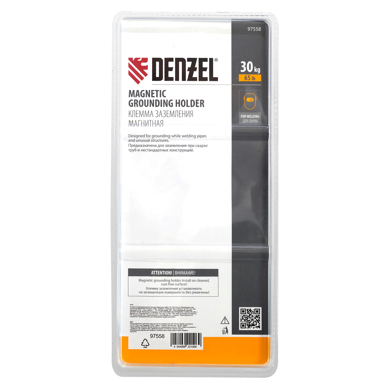 Магнитная клемма Denzel 97558, рассчитанная на усилие 65 LB (30 кг), предназначена для фиксации кабеля заземления на металлической поверхности и используется при проведении сварочных работ. Служит для получения замкнутой электрической цепи, необходимой для процесса ручной дуговой сварки. Позволяет работать со сварочным током до 500 A. Удобна для работы в труднодоступных местах, быстро и надежно крепится как на плоские, так и на изогнутые поверхности.