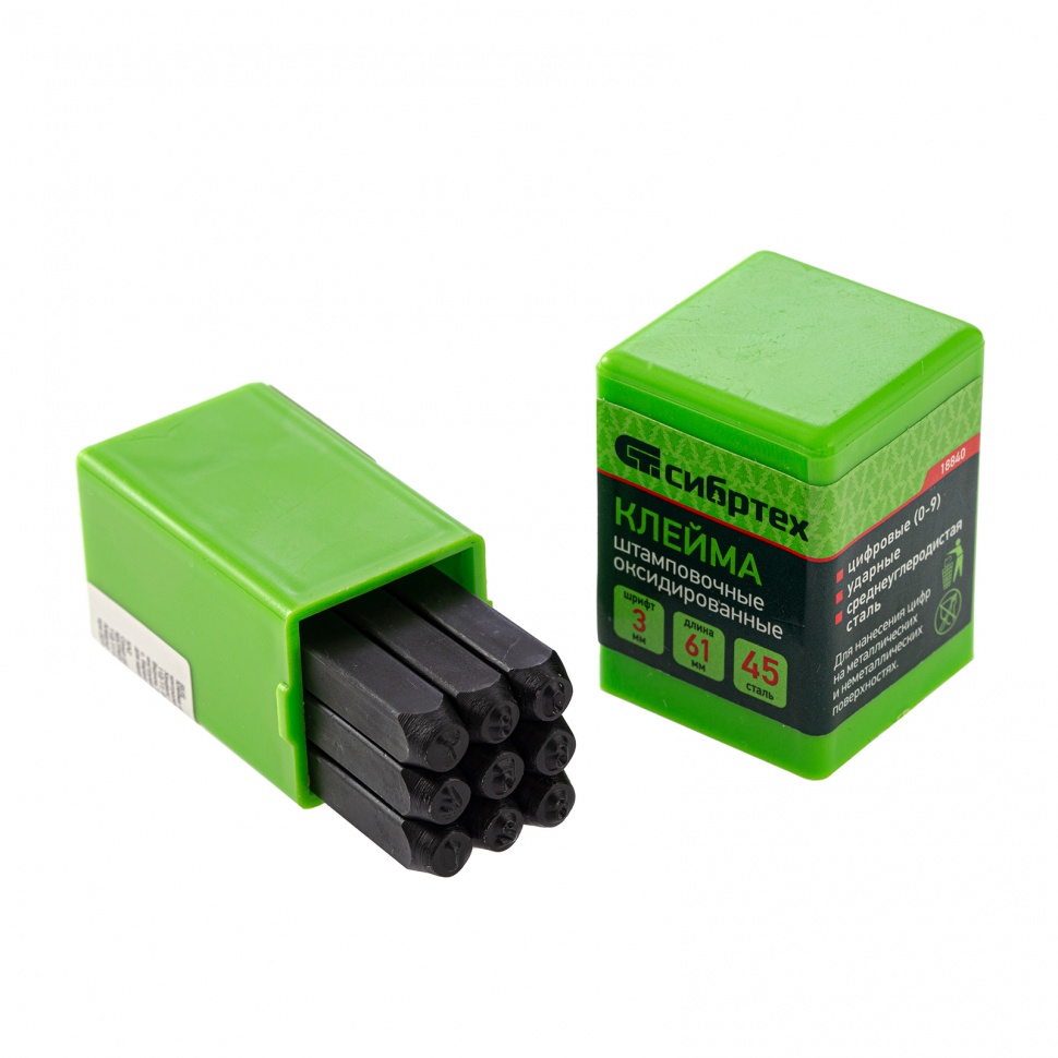 Штамповочные клейма Сибртех 18840 с размером шрифта 3 мм используются для нанесения цифровой маркировки на изделия из металла и других материалов методом ударного воздействия. Изделия обработаны на станках с числовым программным управлением, поэтому отличаются точностью и высокой четкостью получаемых цифр.