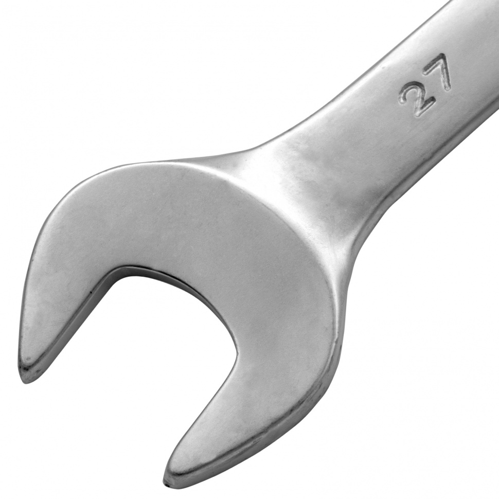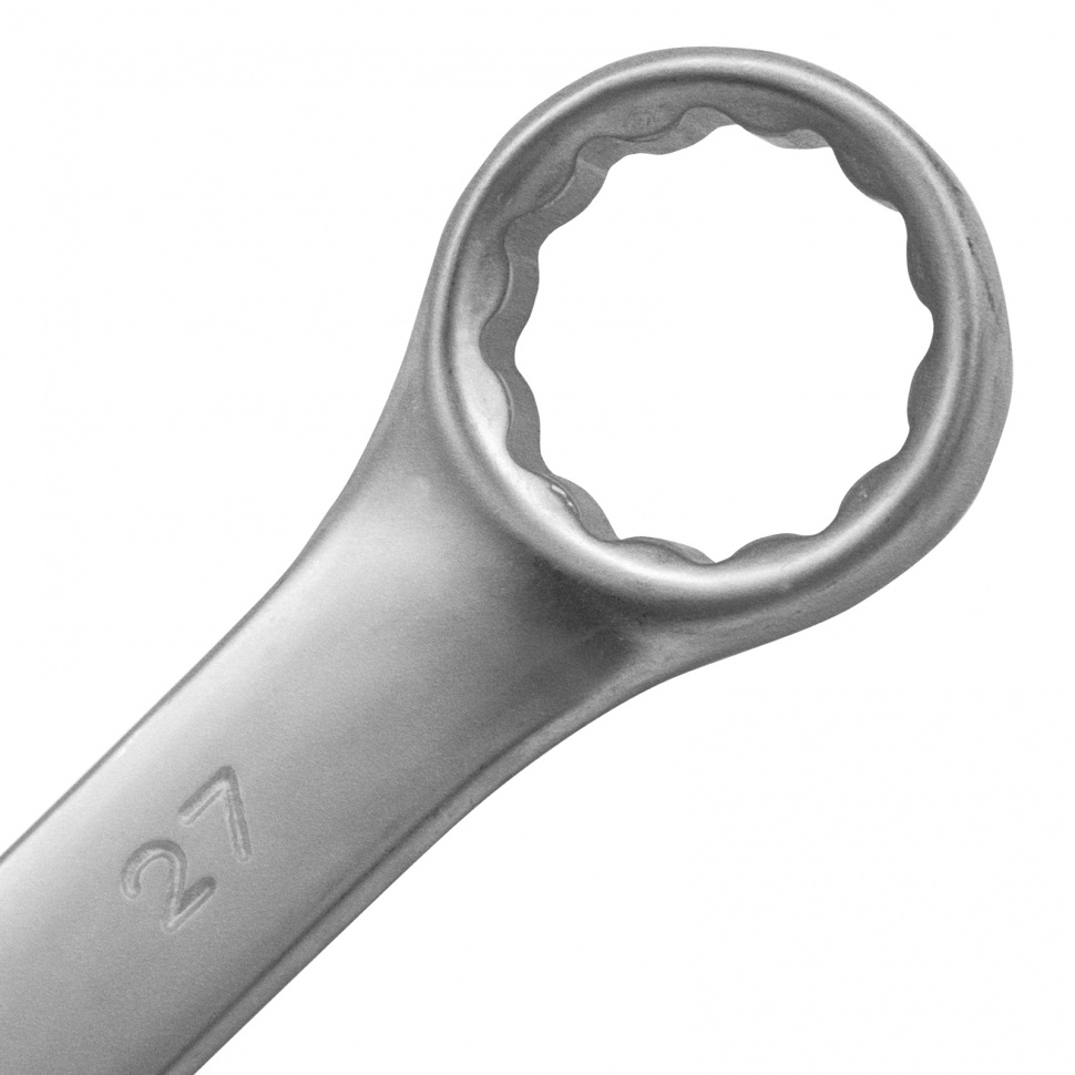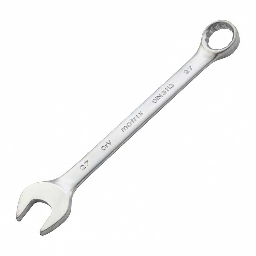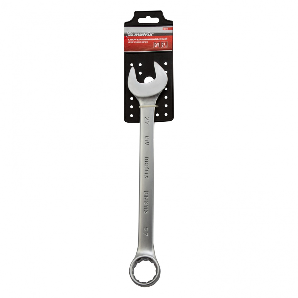 Комбинированный ключ Matrix 15120 размером 27 мм, из стали CrV, с покрытием «матовый хром», пригодится во время ремонтных работ дома или в гараже. С его помощью можно быстро монтировать и демонтировать крепежные элементы. Угол наклона кольцевого зева относительно плоскости инструмента составляет 15°, поэтому ключом удобно работать в труднодоступных местах.