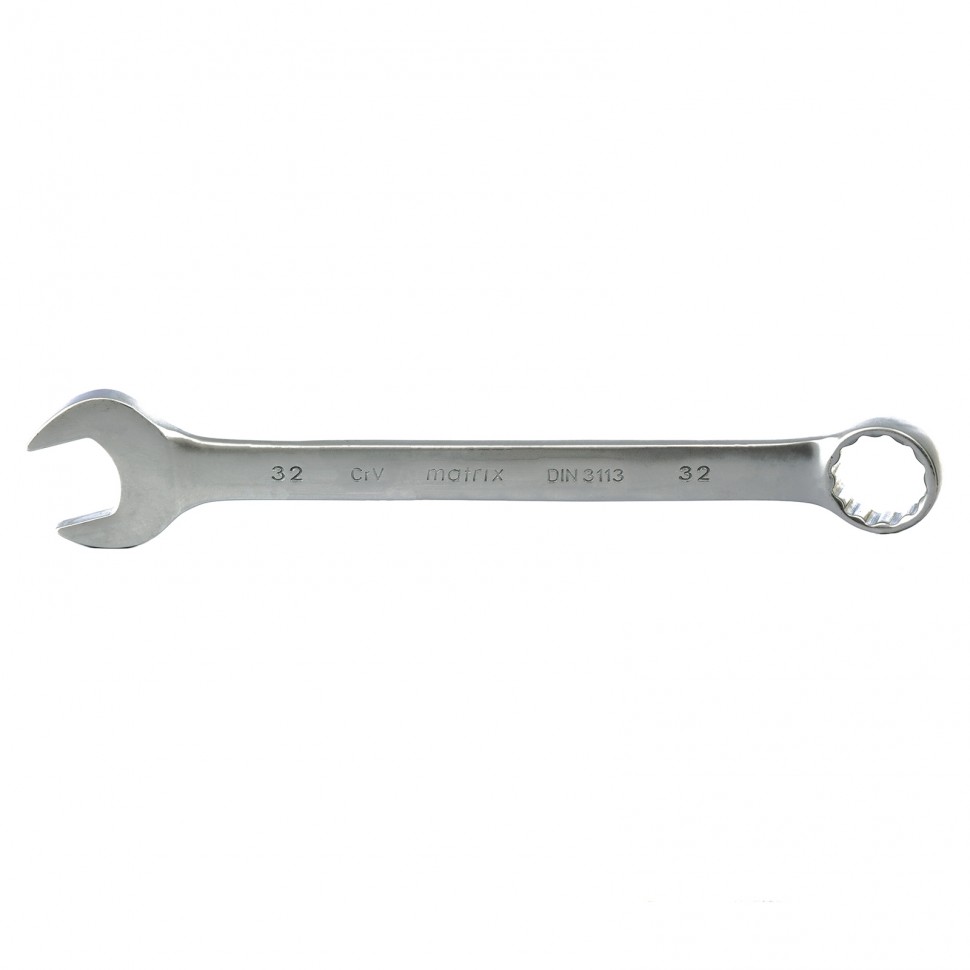 Комбинированный ключ Matrix 15121 размером 32 мм, из стали CrV, с покрытием «матовый хром», пригодится во время ремонтных работ дома или в гараже. С его помощью можно быстро монтировать и демонтировать крепежные элементы. Угол наклона кольцевого зева относительно плоскости инструмента составляет 15°, поэтому ключом удобно работать в труднодоступных местах.