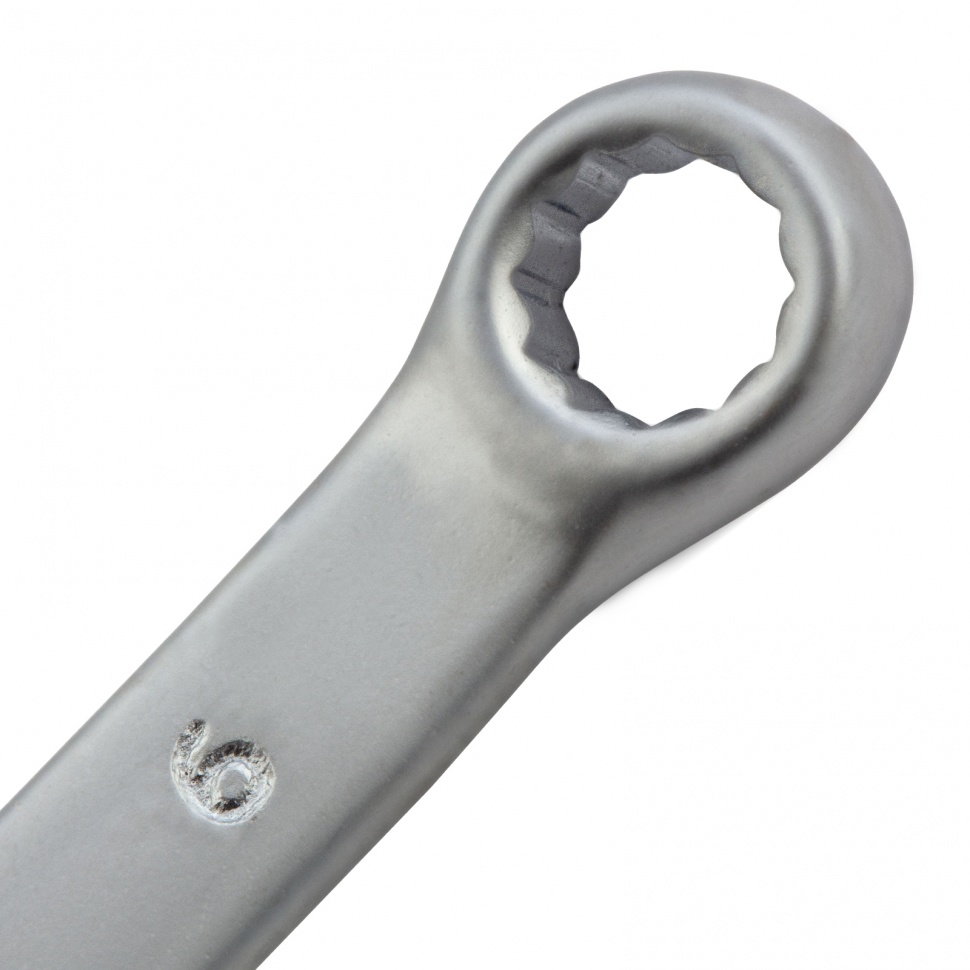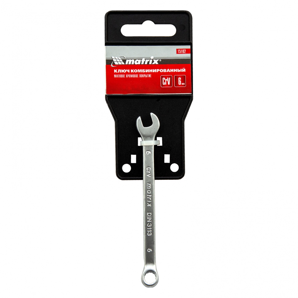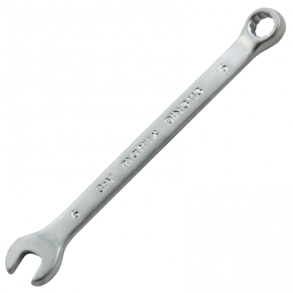 Комбинированный ключ Matrix 15102 размером 6 мм, из стали CrV, с покрытием «матовый хром», пригодится во время ремонтных работ дома или в гараже. С его помощью можно быстро монтировать и демонтировать крепежные элементы. Угол наклона кольцевого зева относительно плоскости инструмента составляет 15°, поэтому ключом удобно работать в труднодоступных местах.