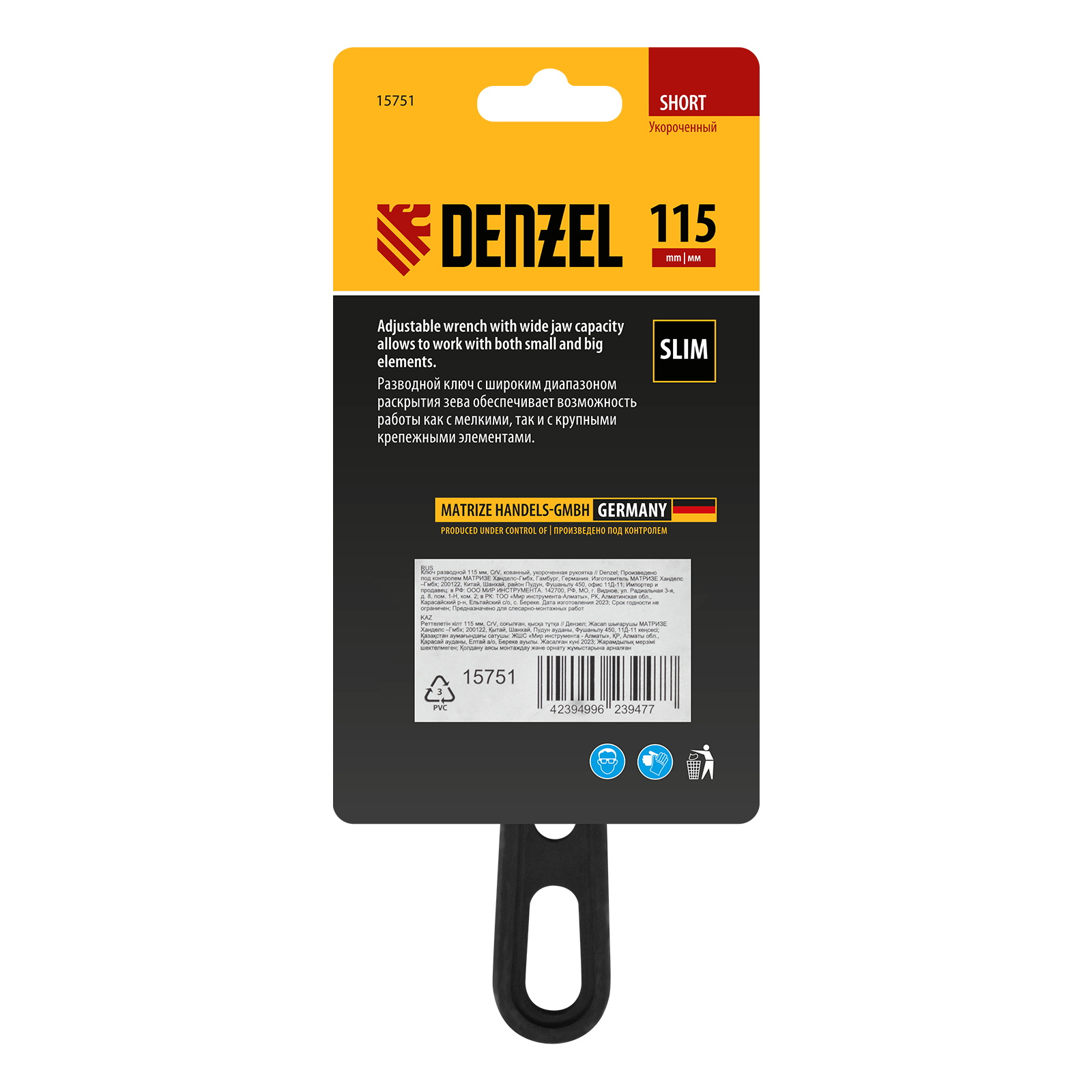 Ключ разводной кованый Denzel 15751 длиной 115 мм, из стали CrV, с укороченной рукояткой и увеличенным раскрытием губок, используется для монтажа и демонтажа крепежных элементов диаметром до 24 мм. Благодаря тонким губкам и укороченной рукоятке удобен для работы в труднодоступных местах. Имеет широкую область применения: сантехнические работы, мелкий бытовой ремонт, полупрофессиональная сфера и т. д.