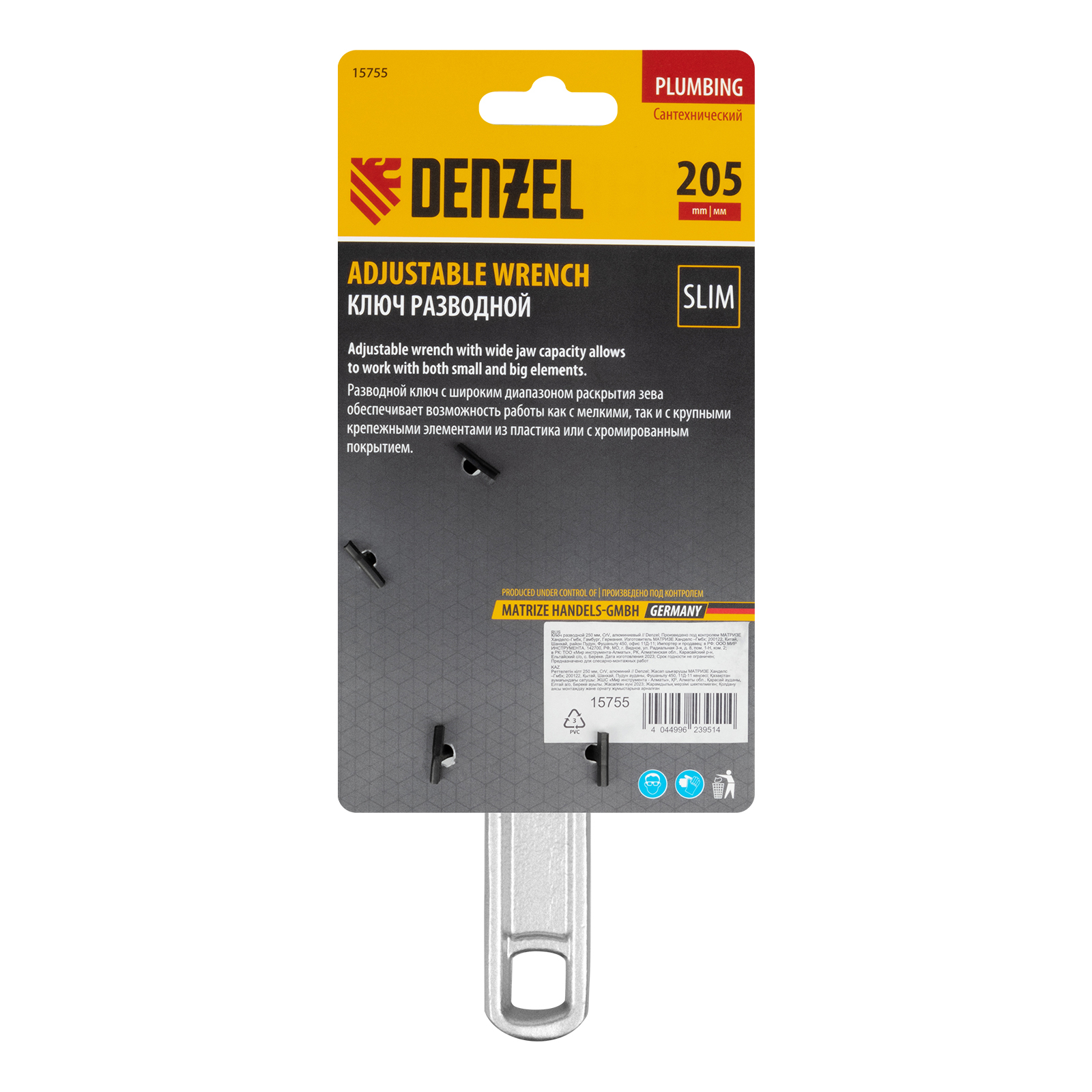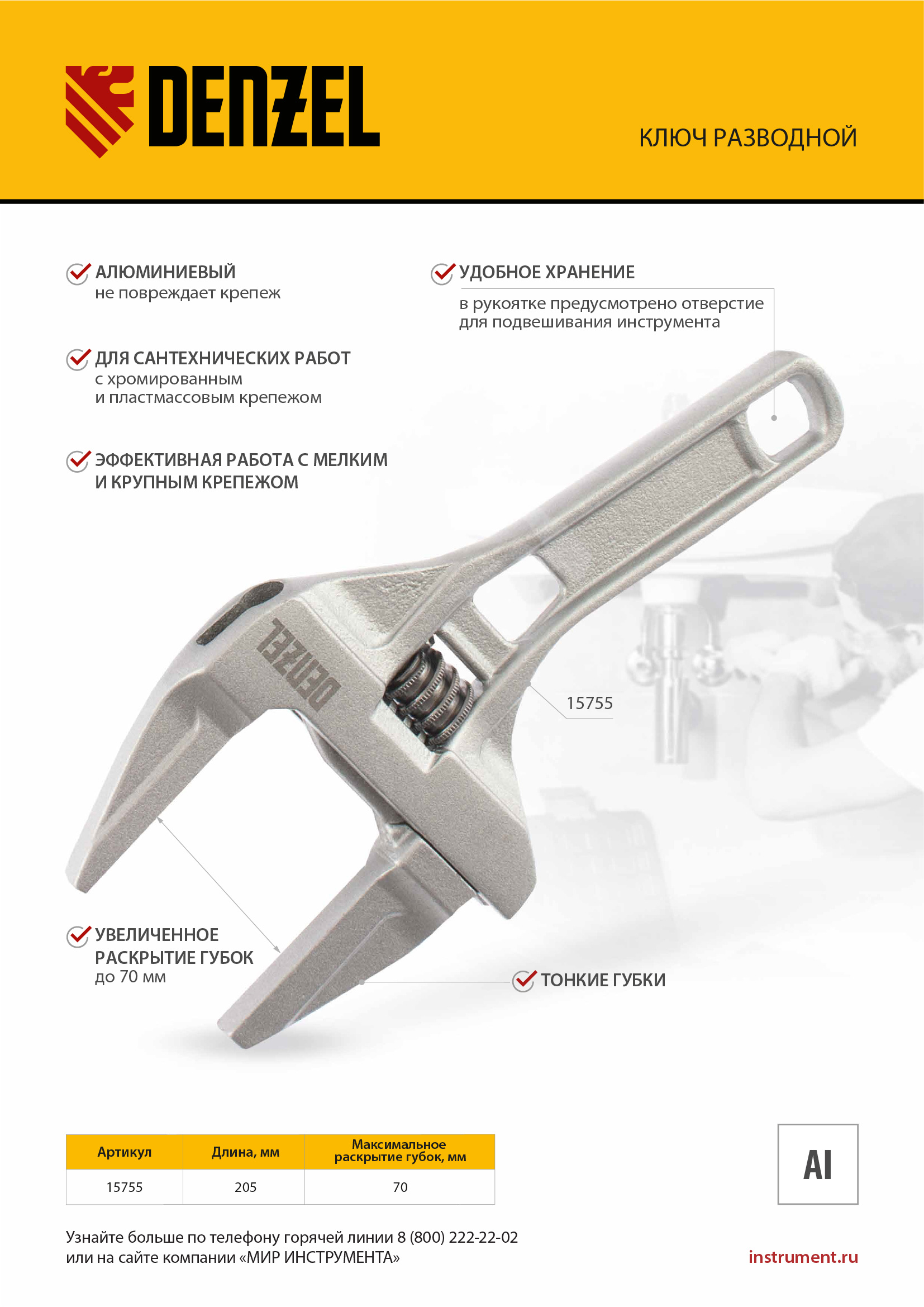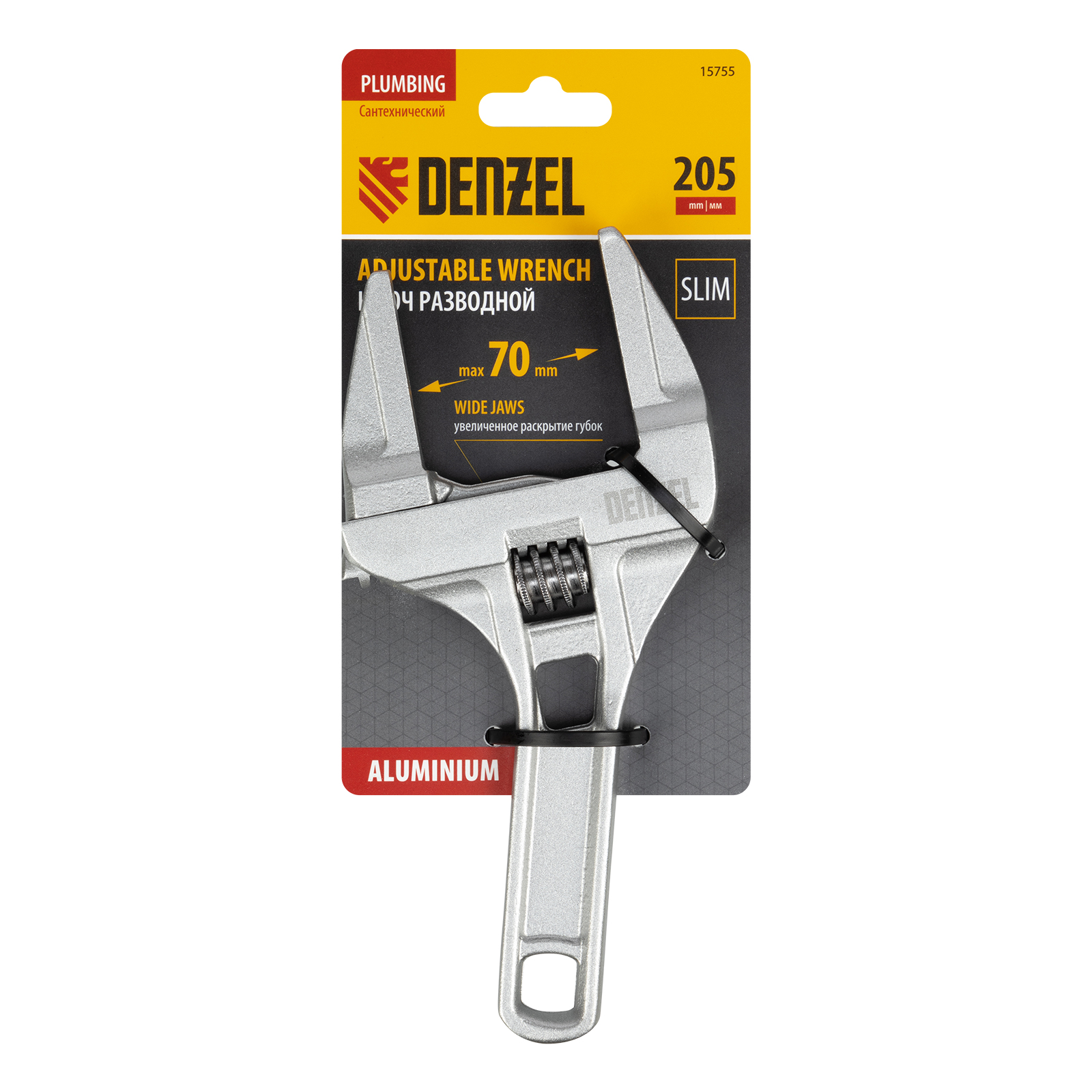 Ключ разводной алюминиевый Denzel 15755 длиной 205 мм, с тонкими губками, оптимален для монтажа и демонтажа хромированных и пластмассовых крепежных элементов. Используется при выполнении сантехнических работ.