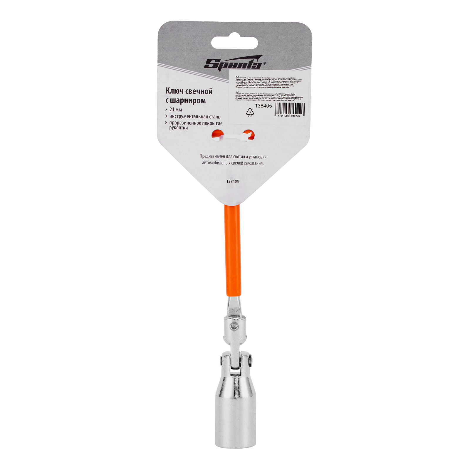 Свечной ключ с шарниром Sparta 138405, 21 мм, предназначен для замены автомобильных свечей зажигания. Он пригодится автолюбителям для самостоятельного ремонта авто и работникам СТО. Ключ легко проникает в труднодоступные места благодаря наличию двойного шарнира. Свеча не выпадает из ключа за счет встроенного резинового кольца.