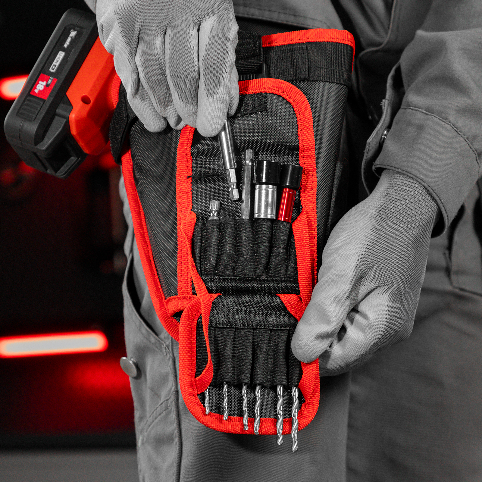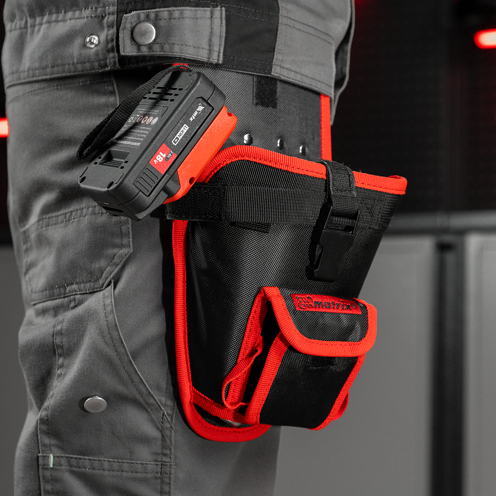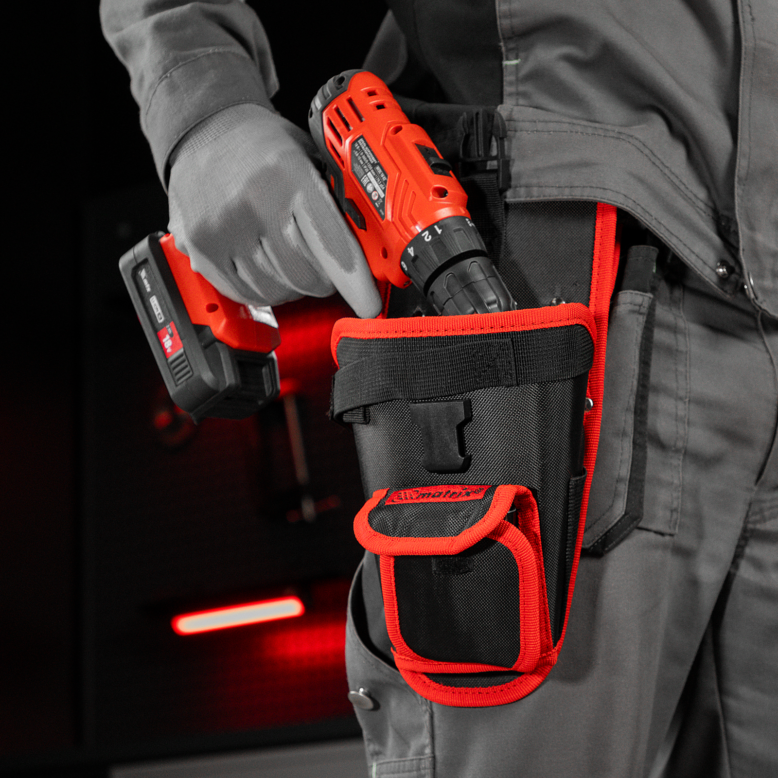 Кобура для шуруповерта с карманом для бит и сверл Matrix 90243 пригодится для выполнения различных работ. Ее можно закрепить на поясе, и инструмент будет под рукой даже во время работы на высоте. Для удобного размещения сверл и бит предусмотрен специальный отсек.