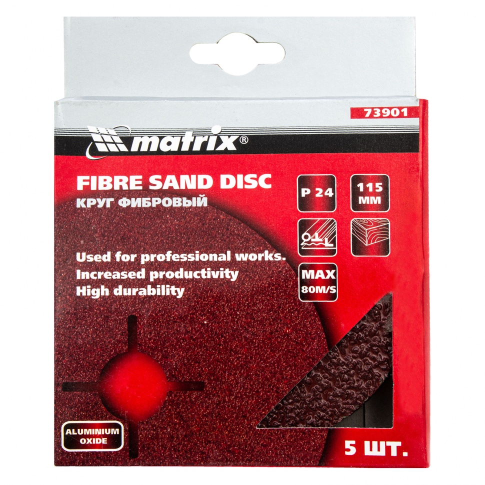 Фибровый круг Matrix 73901 размером 115 х 22 мм, с абразивом P 24, 5 шт. в упаковке, устанавливается на углошлифовальную машину (УШМ) при помощи опорной тарелки для фибровых кругов. Крупнозернистый абразив Р 24 используется для грубой обработки металлических и деревянных изделий, позволяет эффективно зачищать сварные швы, удалять заусенцы, ржавчину, лакокрасочные покрытия. Благодаря прочной основе ресурс у фибровых кругов в 2-3 раза больше, чем у шлифкругов «под липучку».